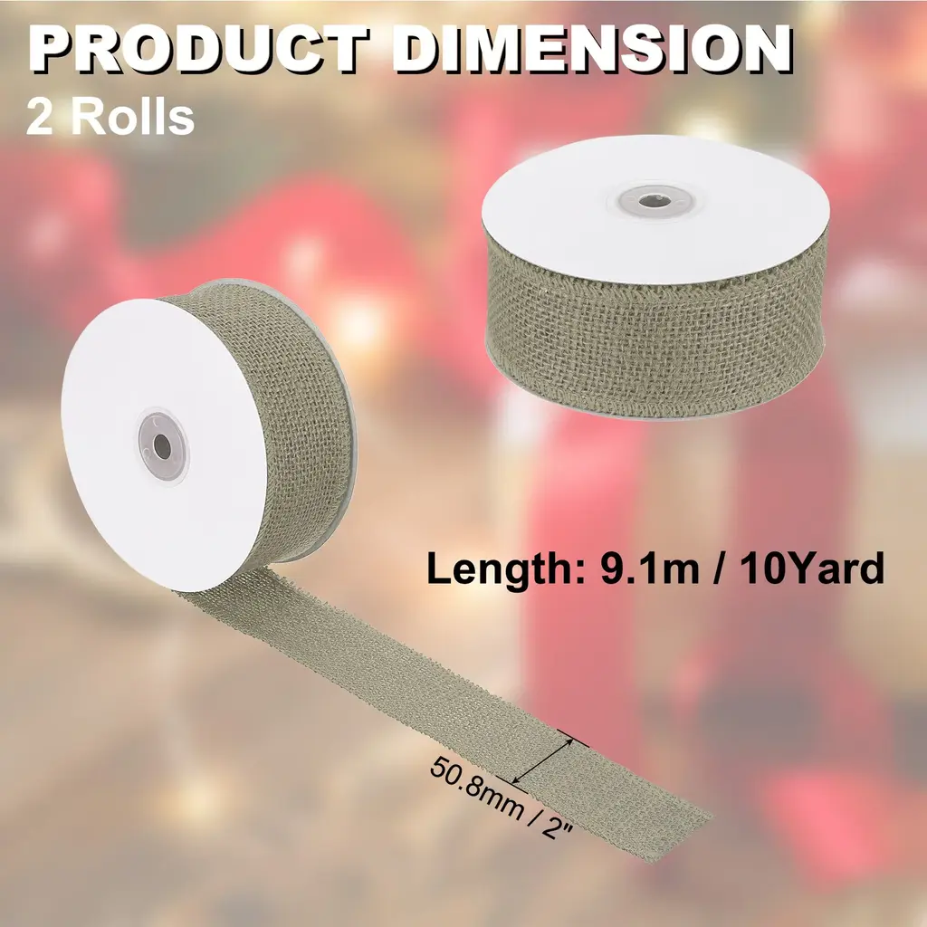 The burlap ribbon is perfect for a variety of occasions, including Christmas celebrations, weddings, parties, and home decoration. It can be used to decorate christmas trees, tables, chairs, vases, bouquets, photo frames, and more. The natural look of the ribbon adds a cozy and warm feel to any space.SpecificationColor: BrownMaterial: JuteSize:1.5 inch x 10 Yard / 38.1mmx9.1m (W*L)Packing List: 2 x Burlap Fabric RibbonAdvantageThe burlap ribbon is flexible yet stiff enough to maintain its shape, making it an excellent choice for burlap trim and wreath making supplies. The natural jute fabric adds a rustic touch to any project, and the ribbon is durable and long-lasting.InstructionTo use the Burlap Ribbon, simply unroll the desired length and cut with scissors. The ribbon can be tied, twisted, or wrapped around objects to add a decorative touch. It can also be used to create bows or other embellishments.Note: When using the Burlap Ribbon, be careful not to get it wet, as it may cause the fabric to shrink. Additionally, avoid exposing the ribbon to direct sunlight for extended periods, as this may cause the color to fade. Finally, keep the ribbon away from open heat sources.