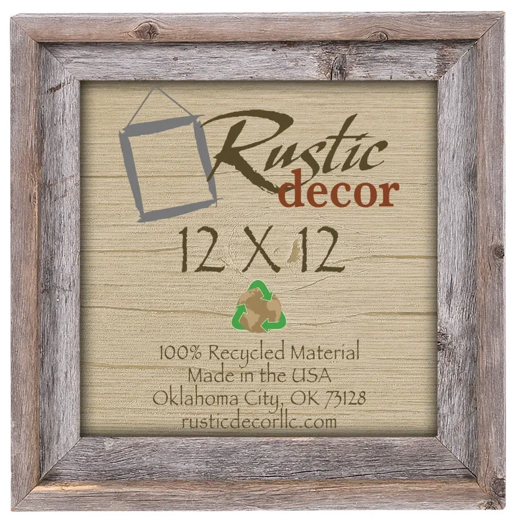 This 12-by-12 inch frame is manufactured from 100% authentic weathered barn wood allowing the rustic charm of the natural knots, nail holes and color variations to show through. This frame is natural in color and comes with plexiglass, back and hanger for wall hanging. All frames are custom-made at the time of order and will vary slightly from the picture due to the nature of the wood. Made in the USA.Outside dimensions: 15"x15"x1"
