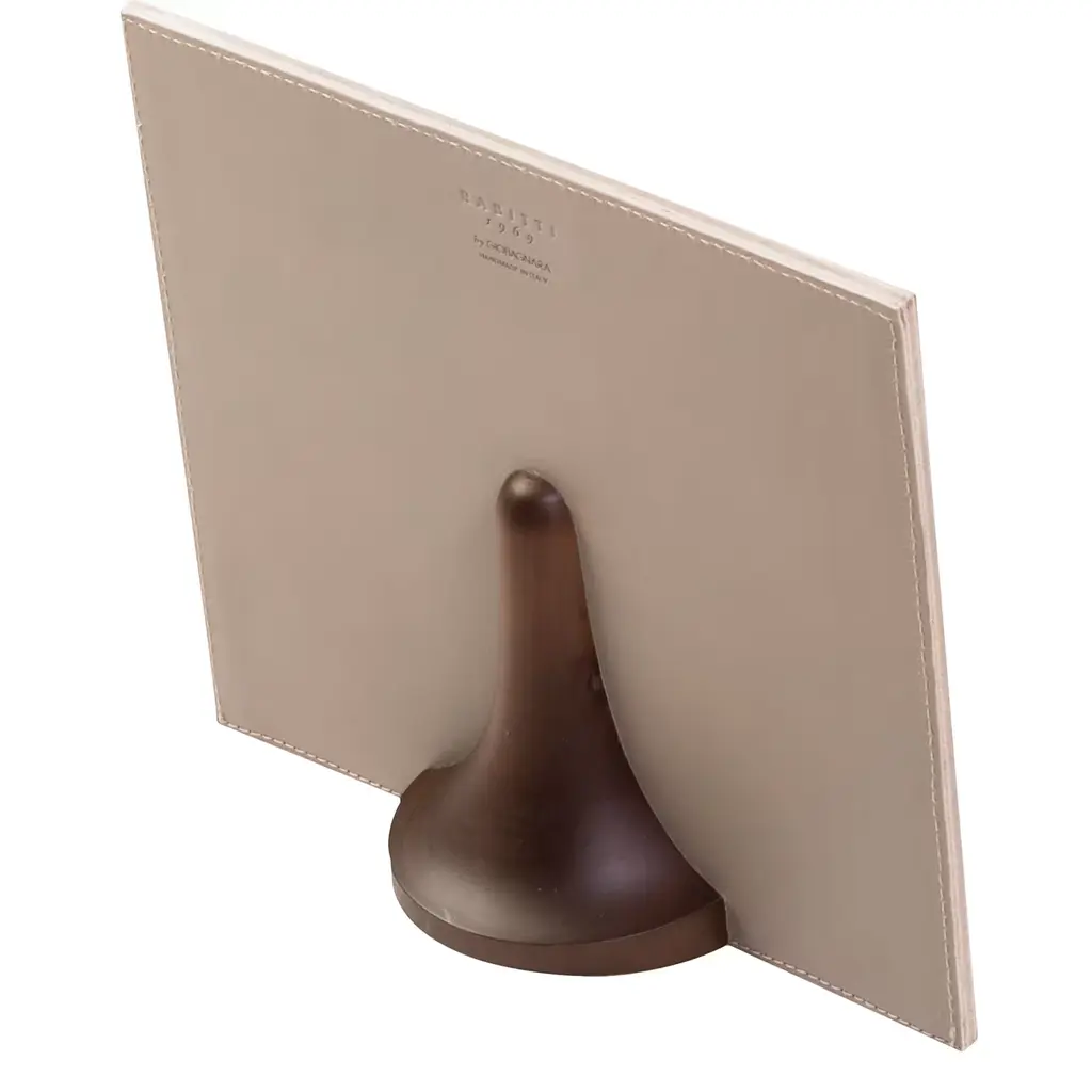 Timeless and sophisticated, this picture frame will be a splendid addition to a mantlepiece, bookcase, or desk in both classic and traditional interiors. Its rectangular shape is fashioned of walnut-finished wood and boasts a front upholstered in fine saddle leather dyed used vegetable pigments in a delicate sand color. The photos within will be protected by the anti-reflected Perspex sheet inside the frame.