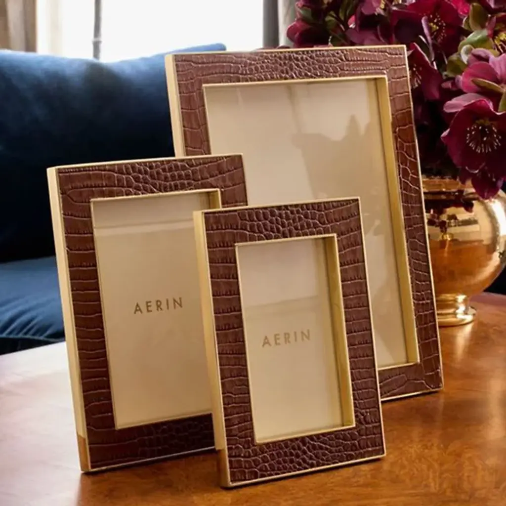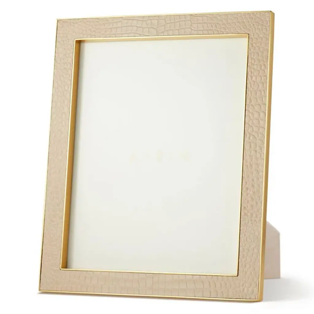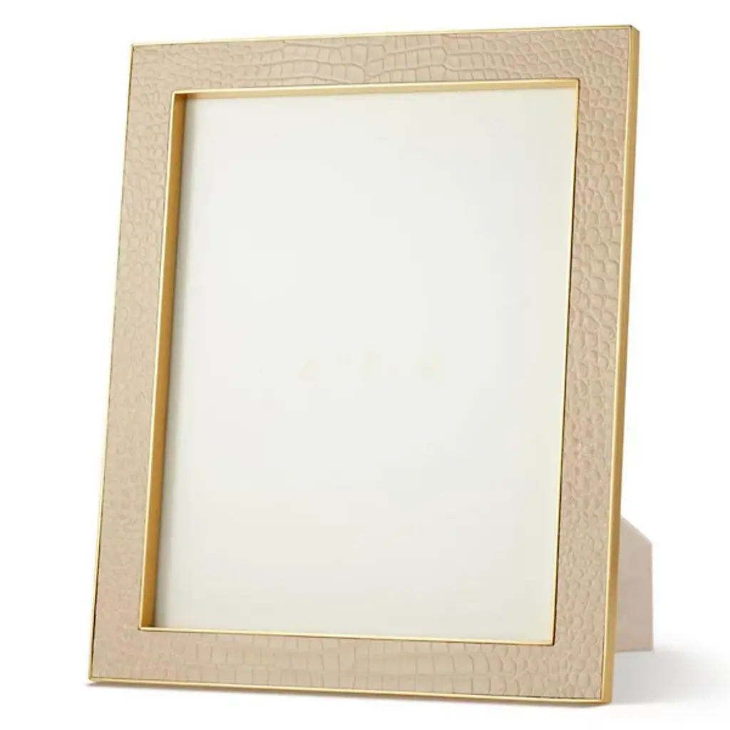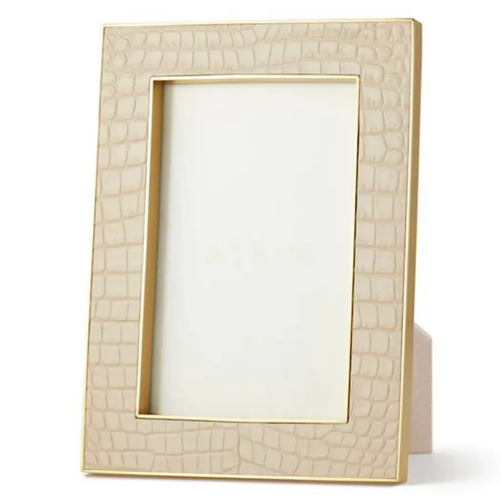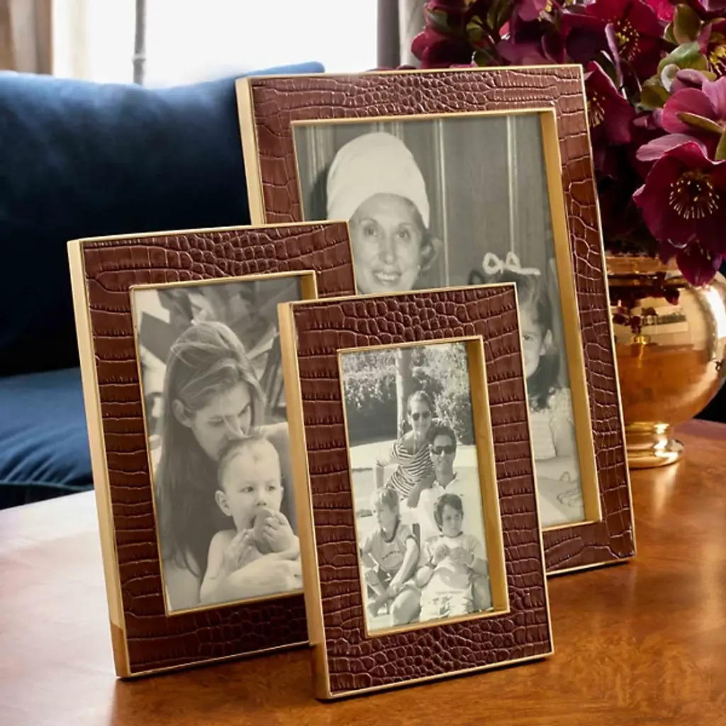 The Classic Croc Leather Photo Frame from AERIN features an embossed crocodile pattern that adds texture to the leather surface. This frame combines traditional craftsmanship with updated details, using brass accents that complement the leather exterior. The crocodile embossing creates depth across the frame's surface while maintaining the soft feel of genuine leather. Each frame includes a built-in easel back for a stable tabletop display, and the neutral tone works well with various photo styles and room decors.