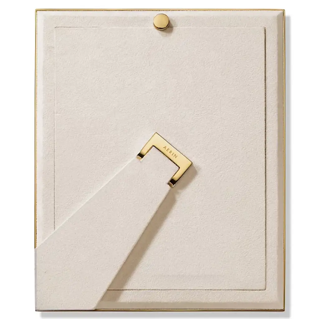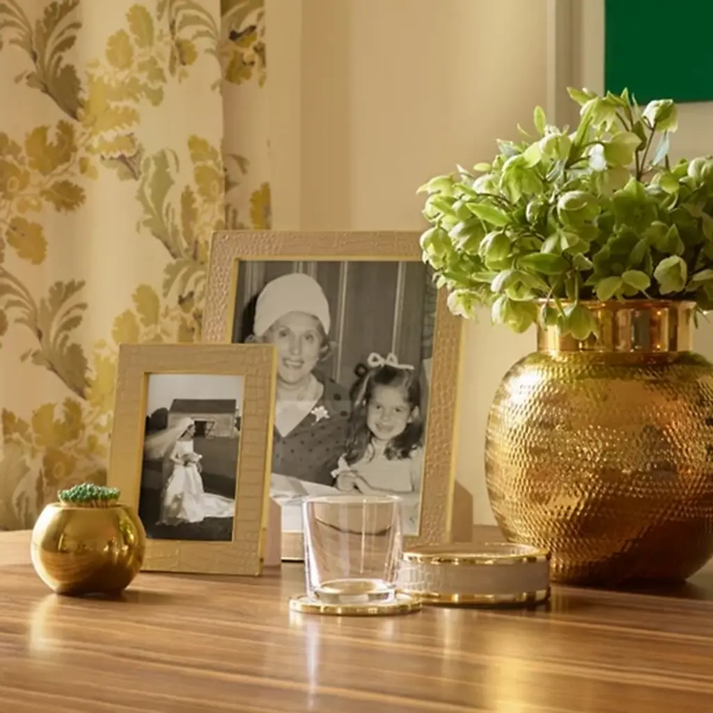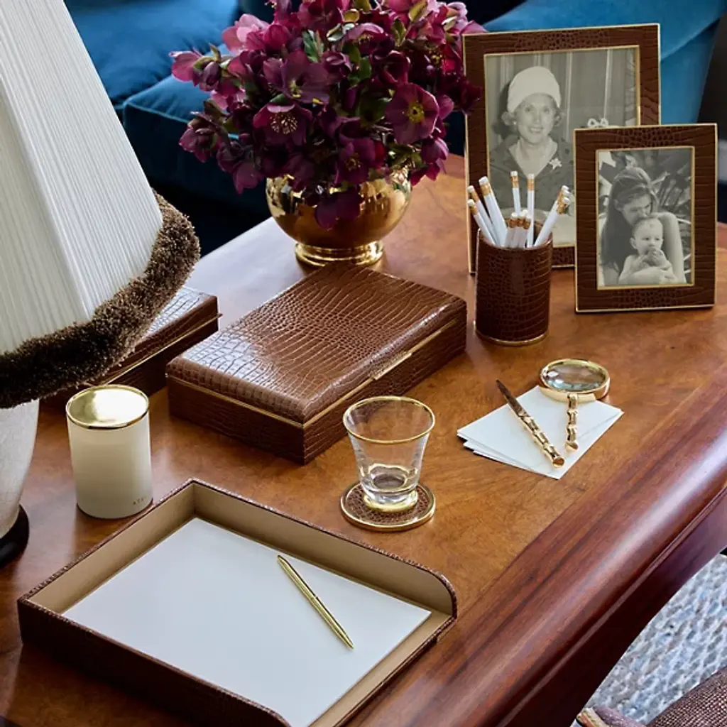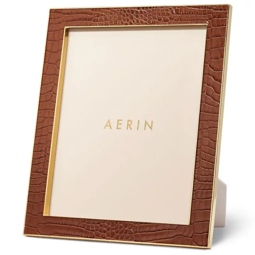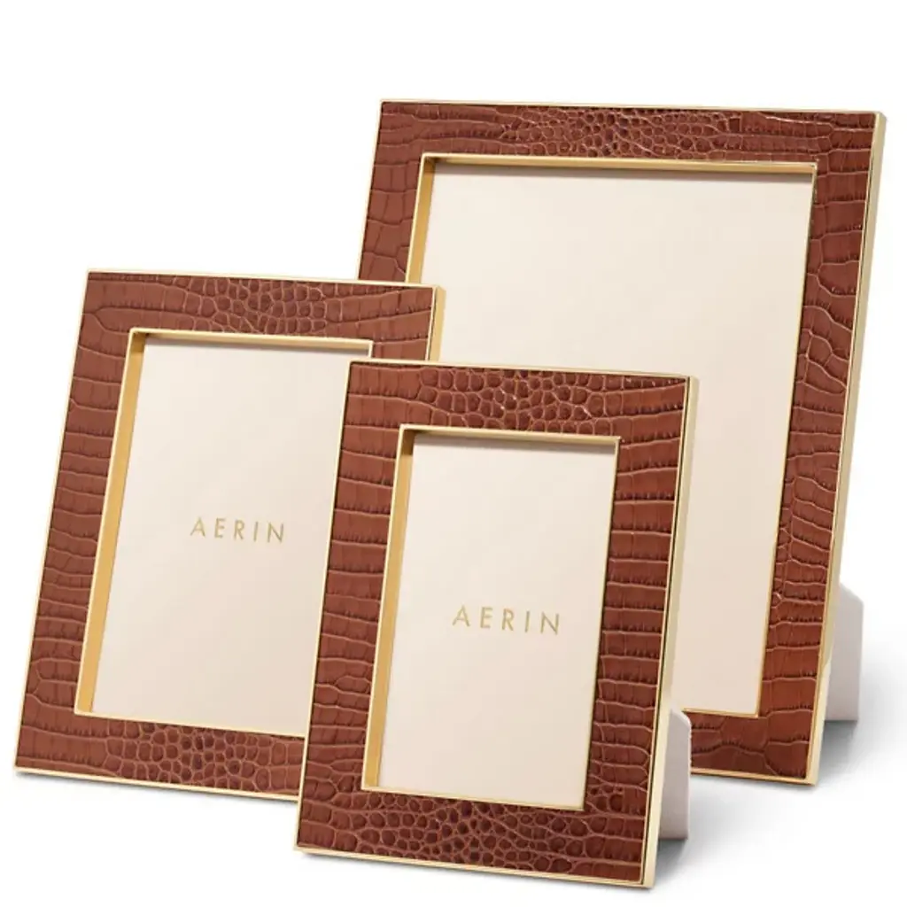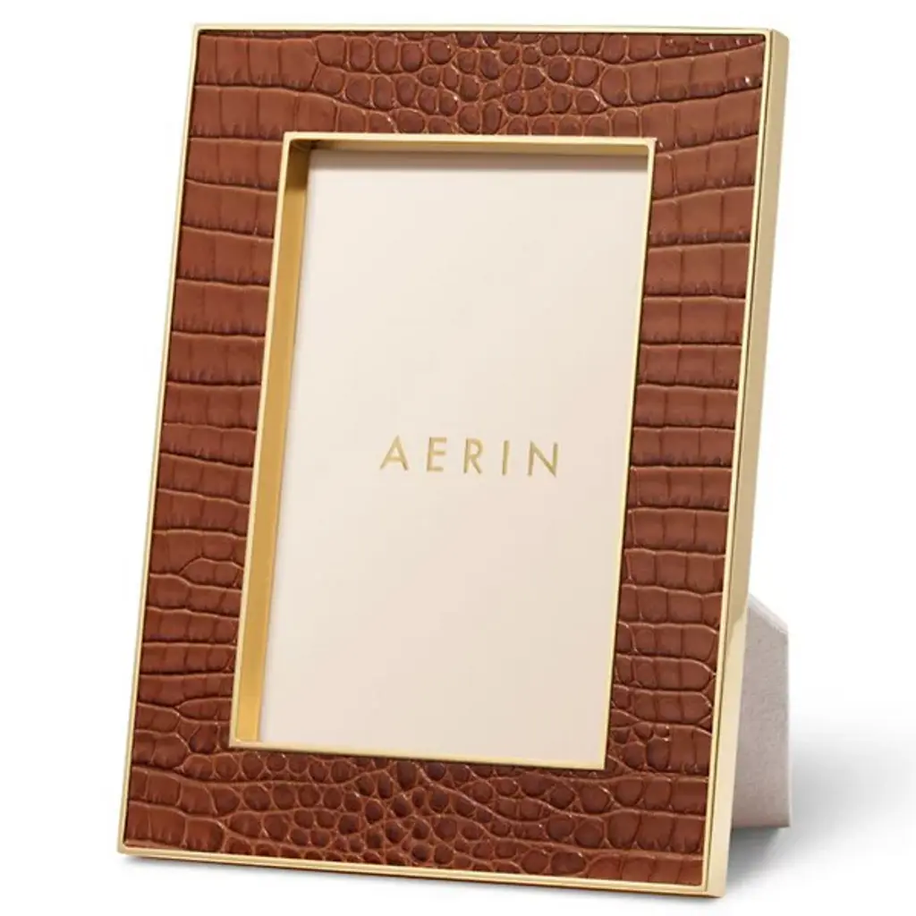 The Classic Croc Leather Photo Frame from AERIN features an embossed crocodile pattern that adds texture to the leather surface. This frame combines traditional craftsmanship with updated details, using brass accents that complement the leather exterior. The crocodile embossing creates depth across the frame's surface while maintaining the soft feel of genuine leather. Each frame includes a built-in easel back for a stable tabletop display, and the neutral tone works well with various photo styles and room decors.