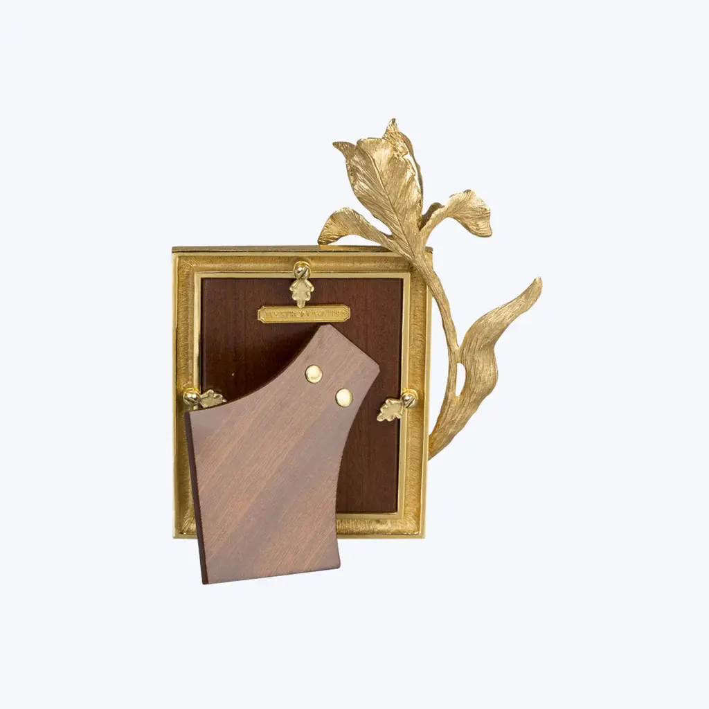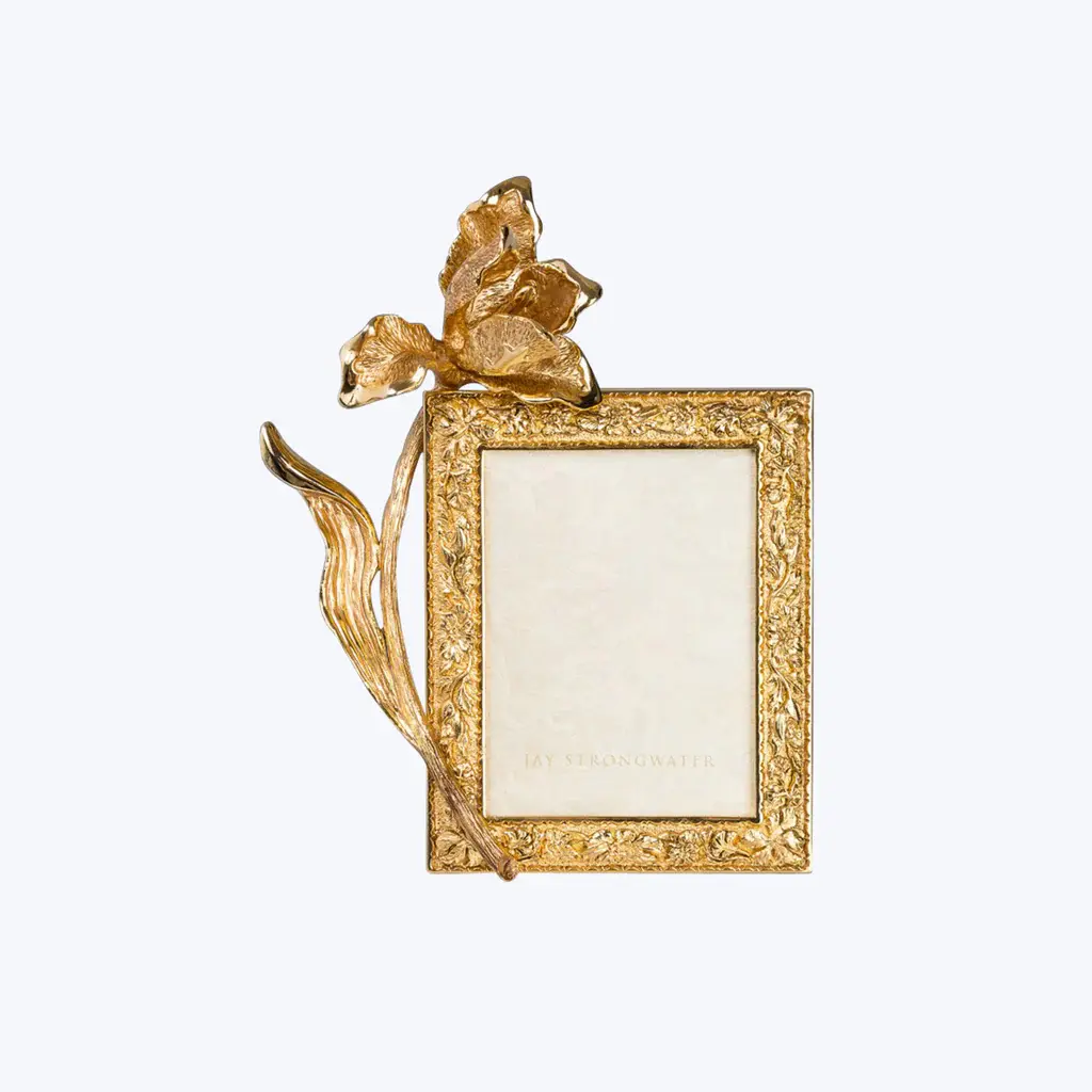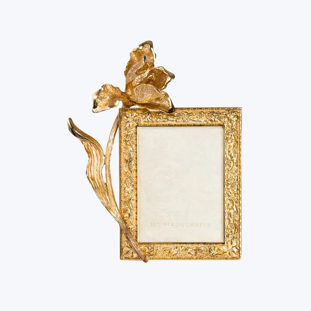 Sunlight glistens on our Claudia Tulip 3" x 4" Frame, allowing the jeweler’s craft of hand carved textures and hand-polished details to shine. Pewter metal is finished in 18K gold at our Rhode Island workshop. The unadorned frame has a polished mahogany wooden back from Spain. Pewter frame with a 18K gold finish made at the Jay Strongwater Rhode Island workshop.