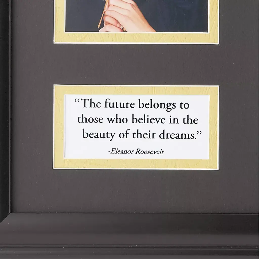 Remember the special day with this beautiful frame that holds a 5" x 7" photo, the diploma and your tassel as a special keepsake. It also includes a quote from Eleanor Roosevelt that says, "The future belongs to those who believe in the beauty of their dreams." Hooks on the back make hanging easy. Glass and plastic. 22 3/4"L x 13 1/2"H.
