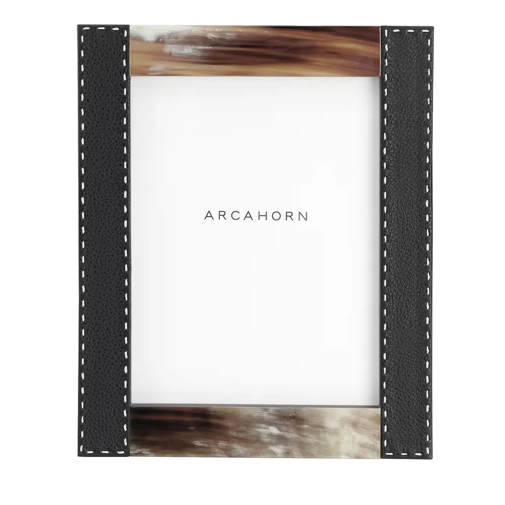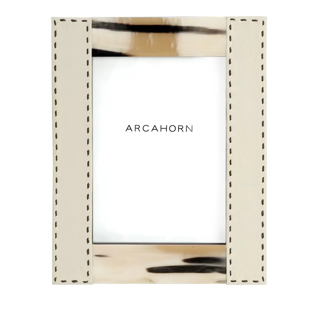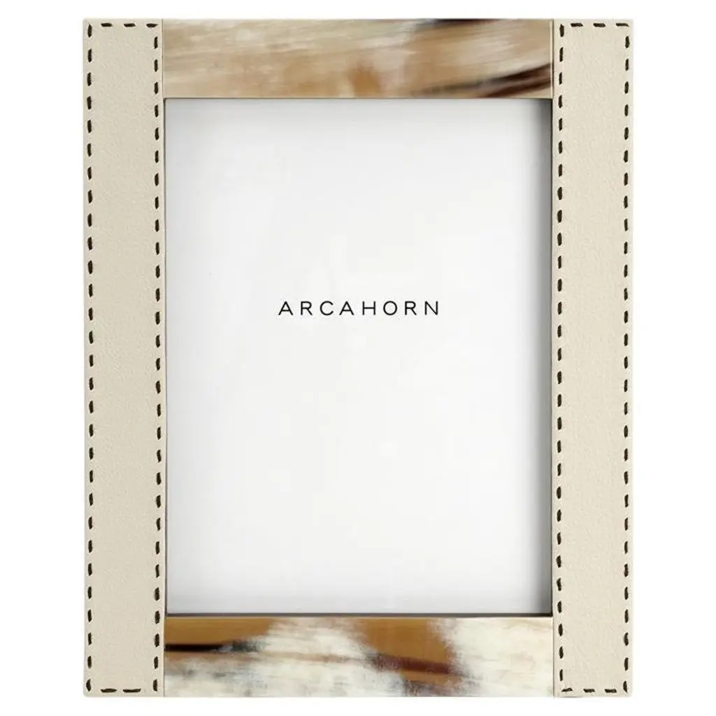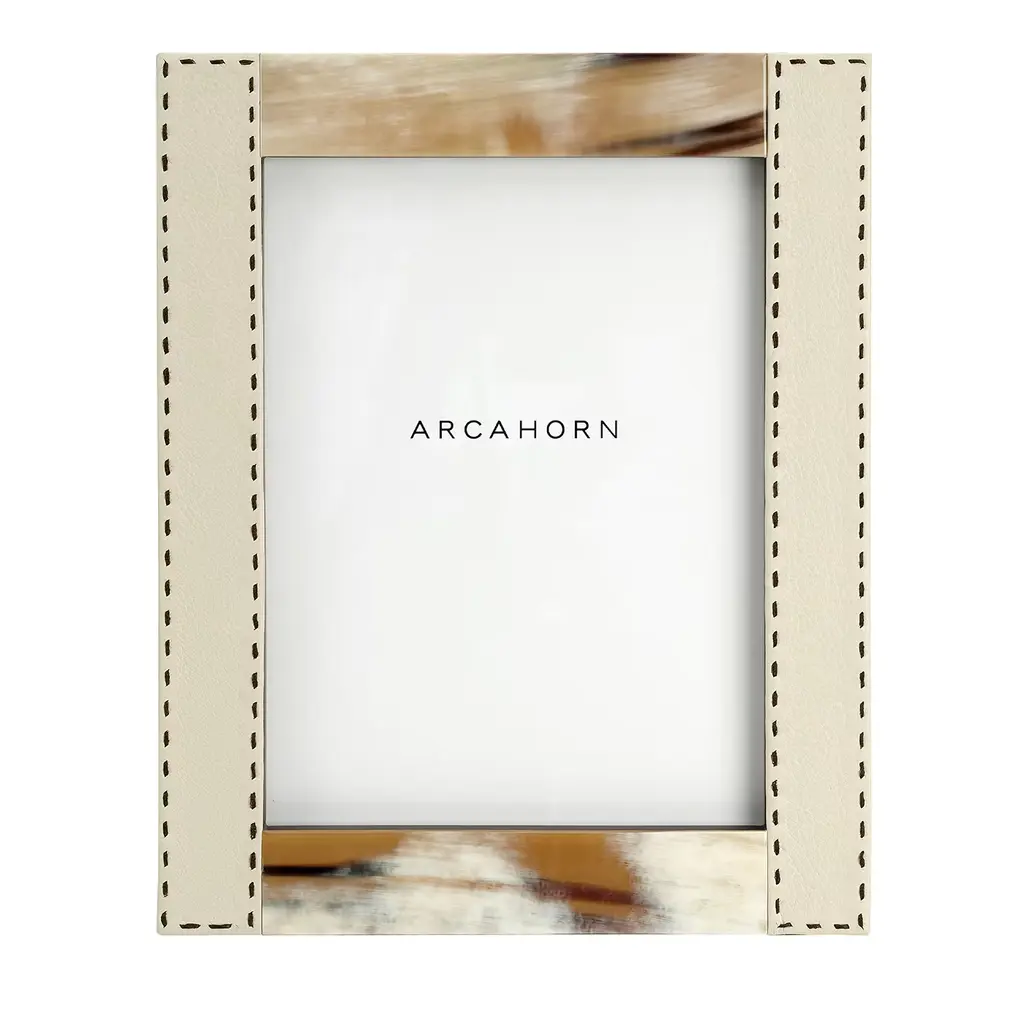 Display your precious memories in style with the Dorotea Picture Frame from Arcahorn. Made with Aida pebbled leather in a delicate Ice-cream color, this frame features an elegant horn detail and handmade dark stitching, adding a tactile element. The Amara ebony veneer edge and back provide a sophisticated finish. Perfect for any luxury home decor or as a thoughtful gift. Highlights