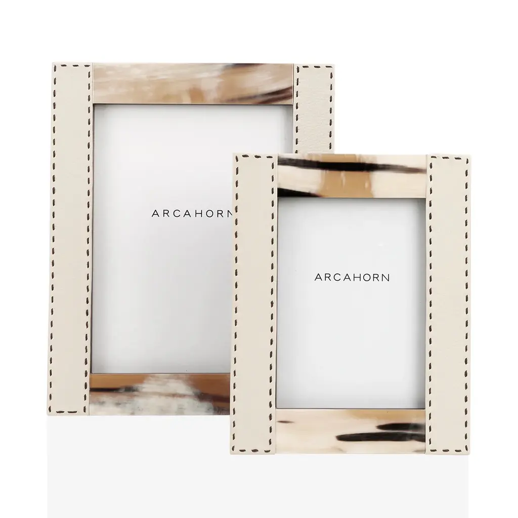 Display your precious memories in style with the Dorotea Picture Frame from Arcahorn. Made with Aida pebbled leather in a delicate Ice-cream color, this frame features an elegant horn detail and handmade dark stitching, adding a tactile element. The Amara ebony veneer edge and back provide a sophisticated finish. Perfect for any luxury home decor or as a thoughtful gift. Highlights