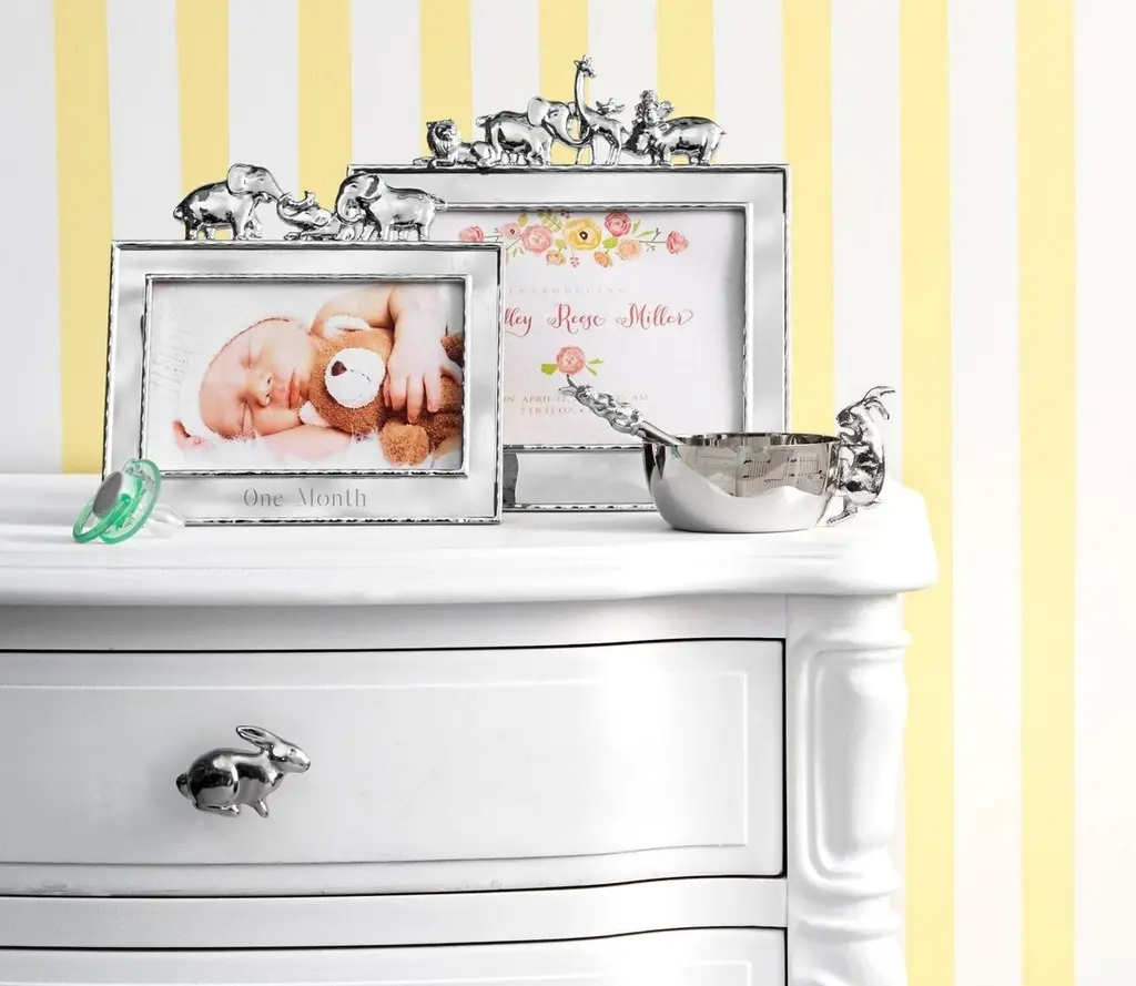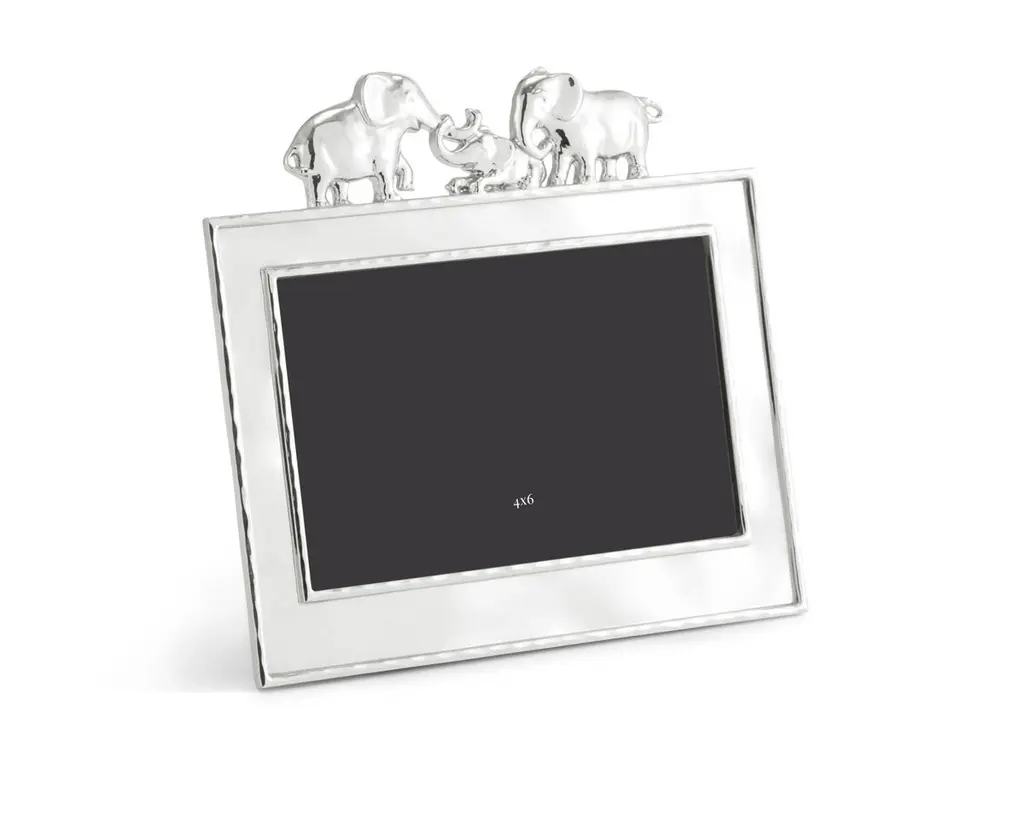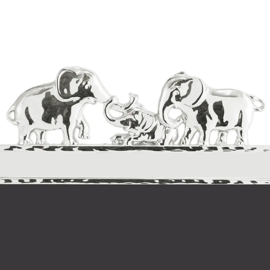 Elephant photo frame with white border, in silver metal and enamel, small size model.Cherish happy times spent with your little ones in this adorable family photo frame in the shape of an elephant. Made from silver metal and covered in enamel, this decorative frame is perfect for showcasing your precious memories. The photo frame is topped with an endearing family of elephants, representing the purest form of love. Perfect for adding a decorative touch to any space. Can only be placed in landscape orientation.Photo frame: H: 17.78 cm, W: 16.51 cm, D: 1.5 cmPhoto: H: 15.24 cm, W: 10.16 cm