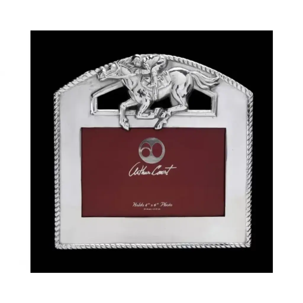Project your love of horseback riding across the room with this 5x7 Equestrian Photo Frame from Arthur Court. Leathery straps wrap around the rein rings as bits connect in systematic fashion along the picture's border. The varying shapes in the handmade, aluminum frame form a visually appealing design.