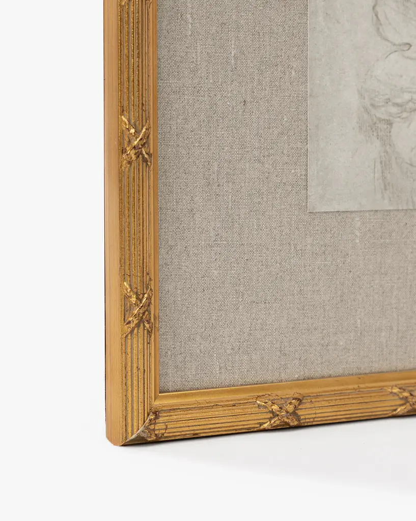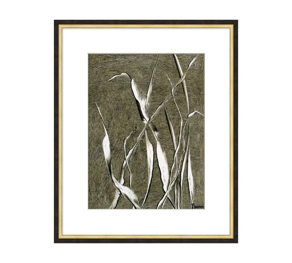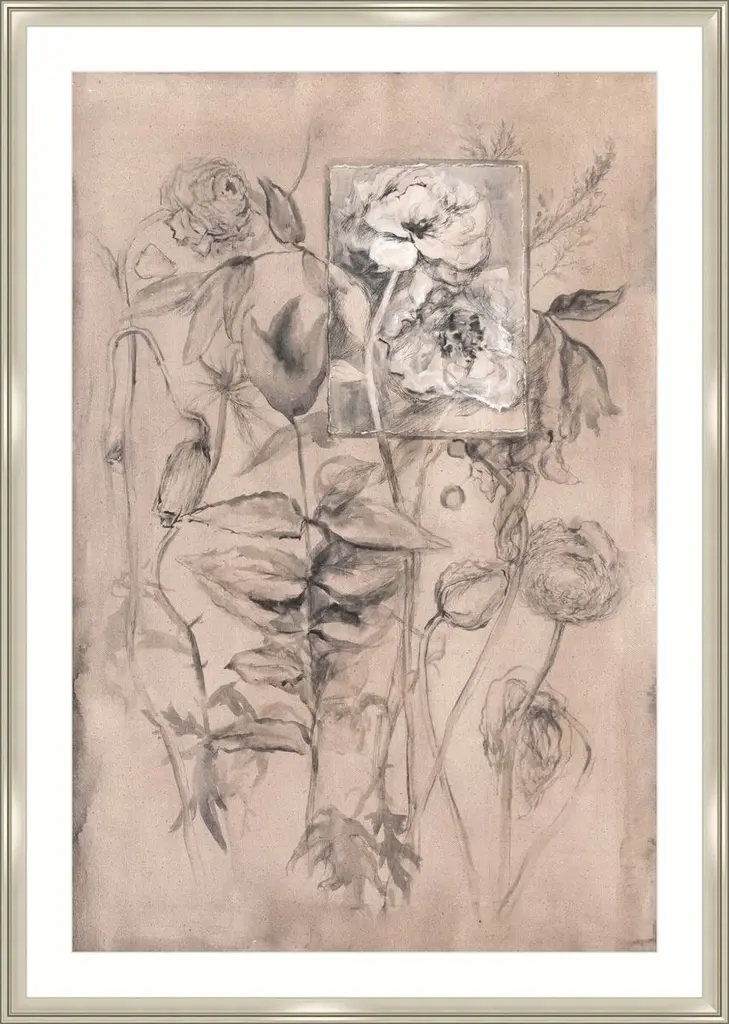 Artfully crafted with a thoughtful mix of materials, Feathery Floral is sophisticated yet full of character. The composition, boasting beautifully detailed florals, is a gicl ee on paper that is straight cut and mounted on a clear primed linen mat. Its elegance is further enhanced by a gold leaf frame, introducing a rich warmth to the piece's timeless neutral tones.