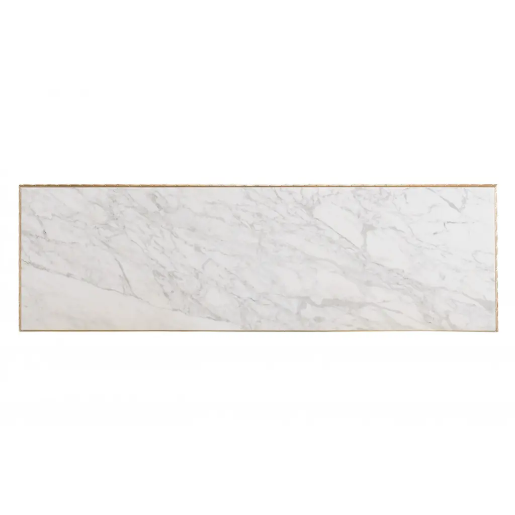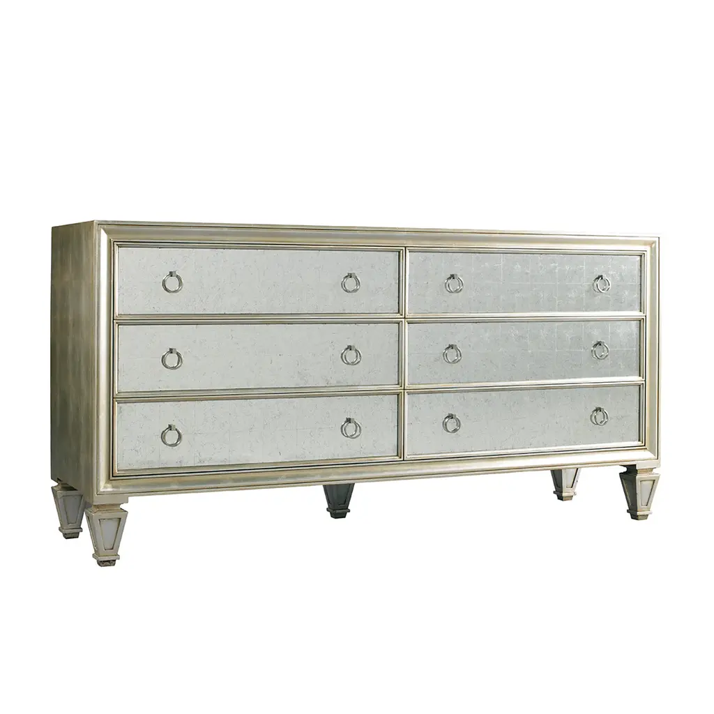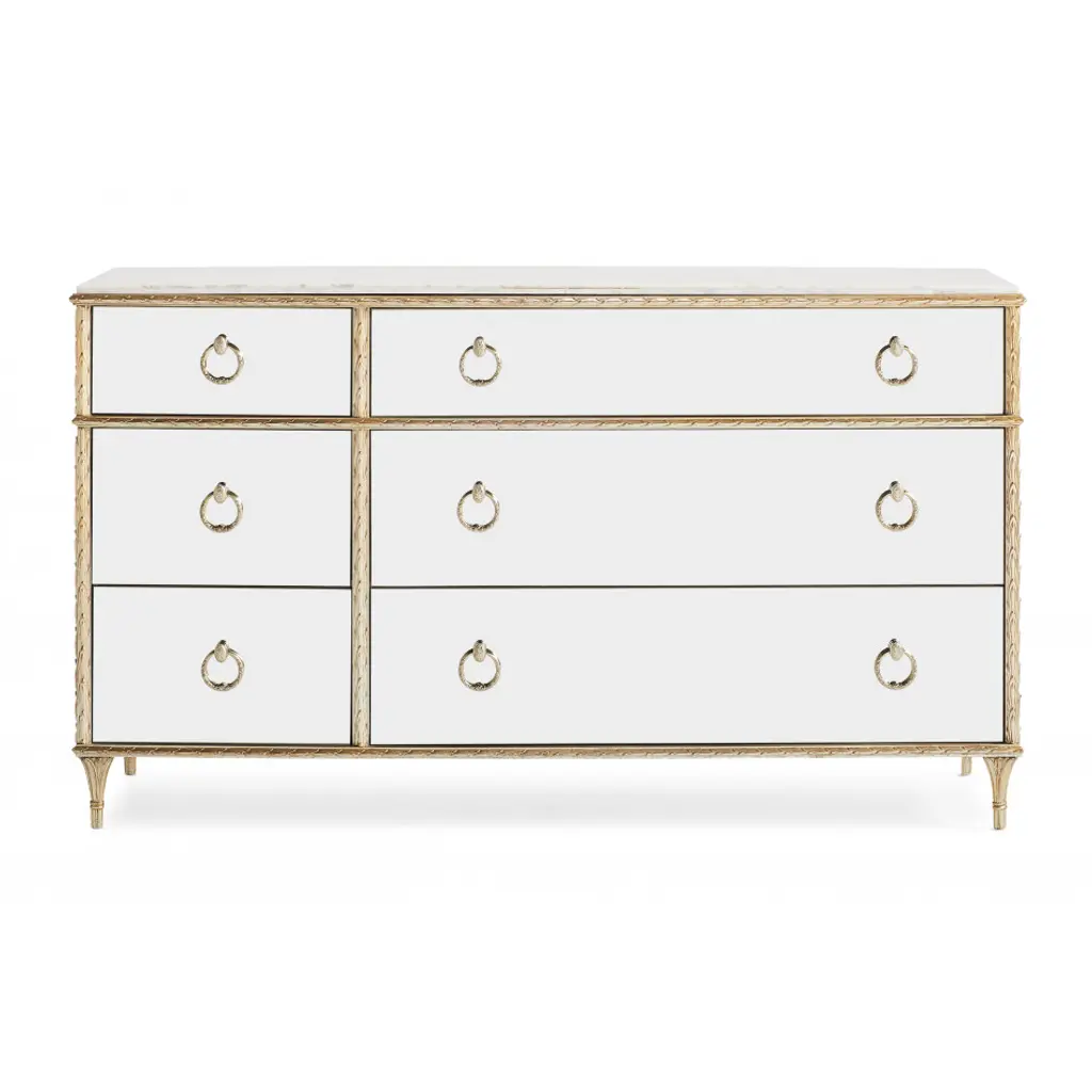 Exuding one-of-a-kind style, this elegant double dresser draws inspiration from the timeless beauty of antique Baroque picture frames. Richly carved laurel leaf motifs are brought to life in an Aglow finish surrounding this nightstand’s exquisite mirrored exterior. Six spacious drawers offer generous storage for your wardrobe and are fully finished in a soft Crème De La Crème. As functional as it is fashionable, this distinctive dresser also features a ¾-inch Carrara white marble top that adds durable functionality while reflecting its classic design roots. As you appreciate the offset placement of its mirrored drawers, you’ll notice custom-designed ring pulls with vintage cameo buttons reflected in splendor.