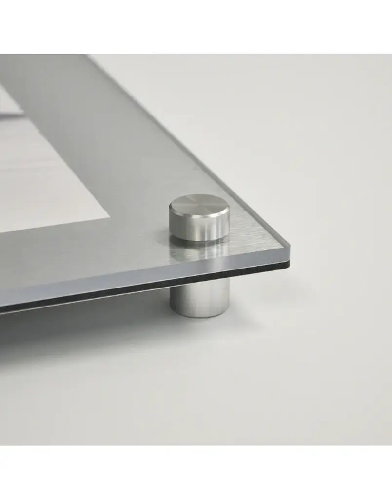 11.5"x14" Futura Stand-Off Frame for an 8"x10" & 8.5"x11"May be used in both Landscape and Portrait Orientation.Actual product size is 11.5" x 14"Made to Order in the USA using domestic non-yellowing acrylic and quality brushed Aluminum ACM.