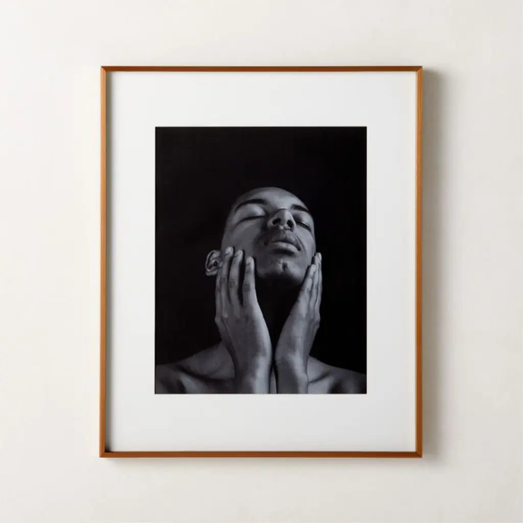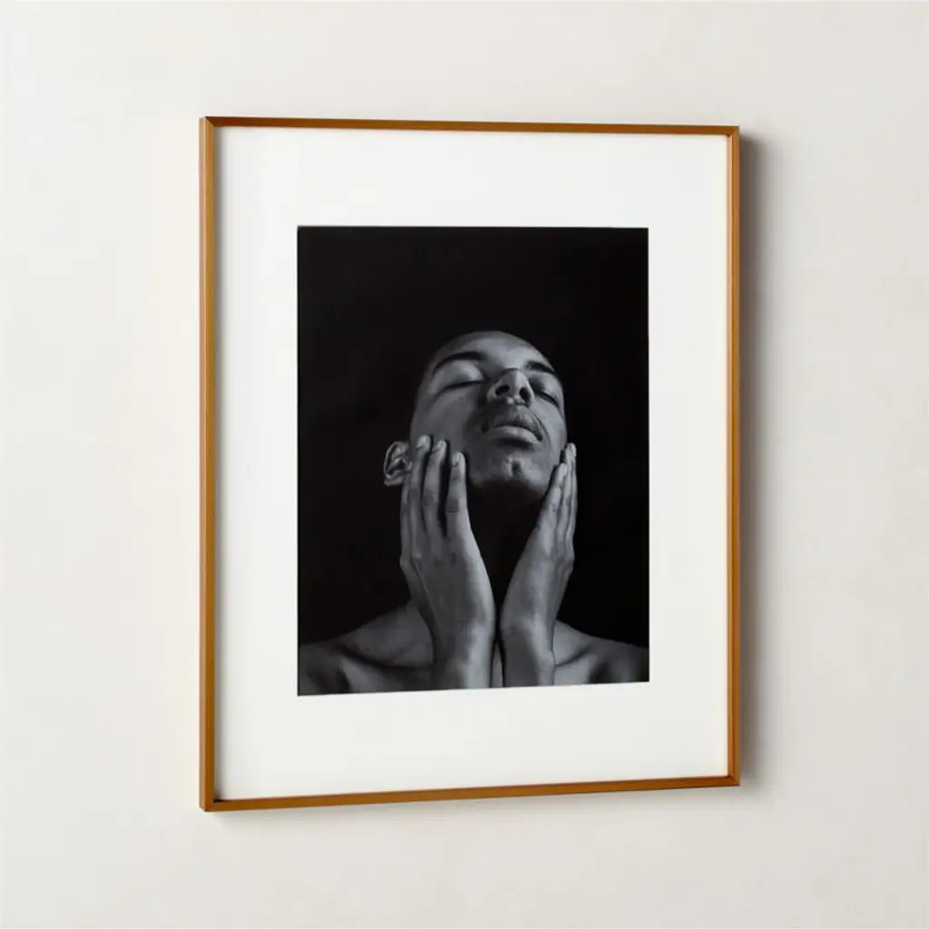 Exhibit your favorite photos and images gallery-style. White mat floats one 16x20 within a sleek picture frame of brass-finished aluminum. CB2 exclusive.
