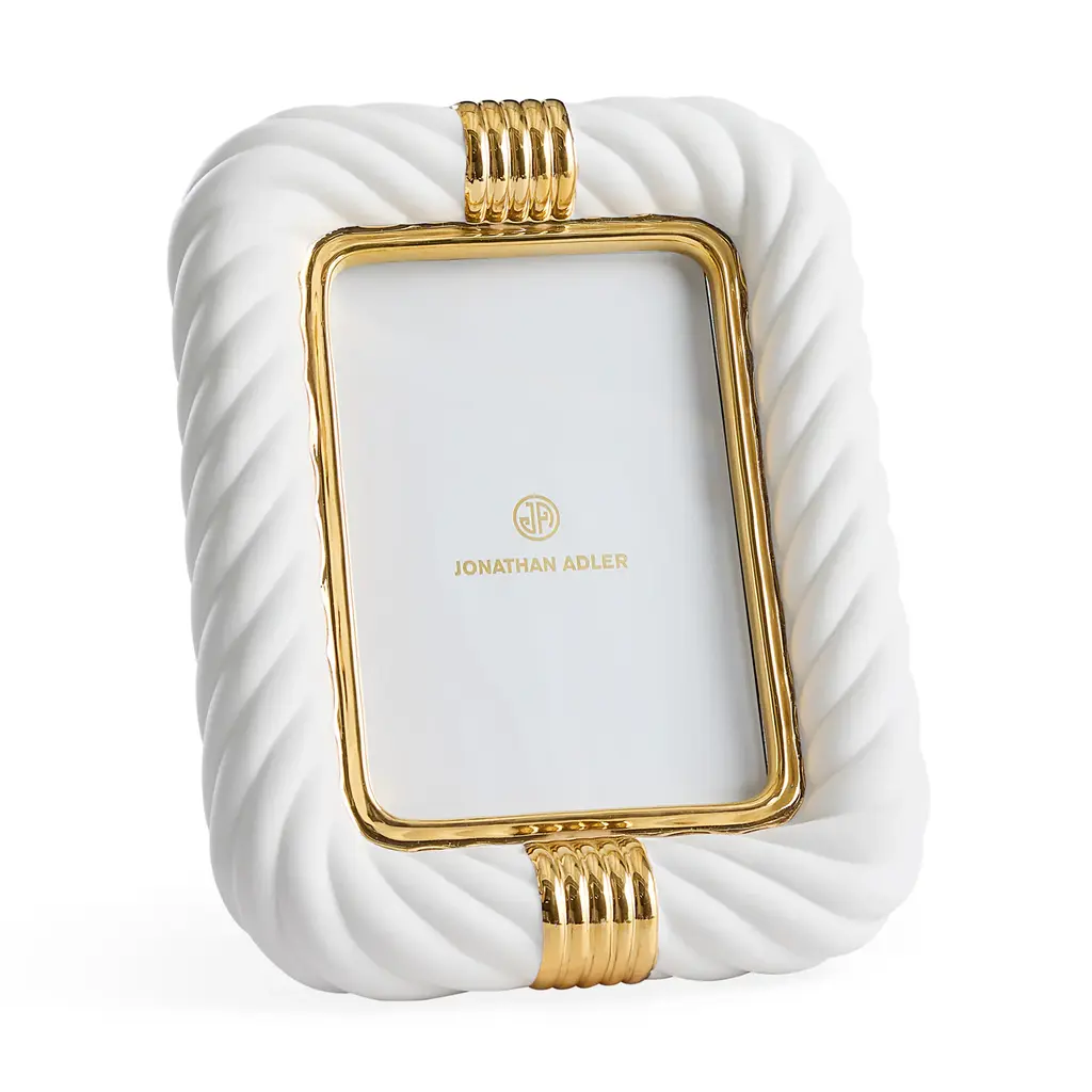 The Twist. A little nautical, a lot glamorous. Our Geneva picture frames feature a sculptural wound rope crafted from high-fired unglazed porcelain and hand-painted gold accents that add an architectural touch. A luxe look on your shelf, mantel, or tablescape, and the perfect place for memories to pop. All of our frames are ready for gifting in a bow-ready box and include a dust bag embroidered with the Jonathan Adler logo.