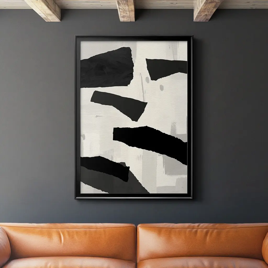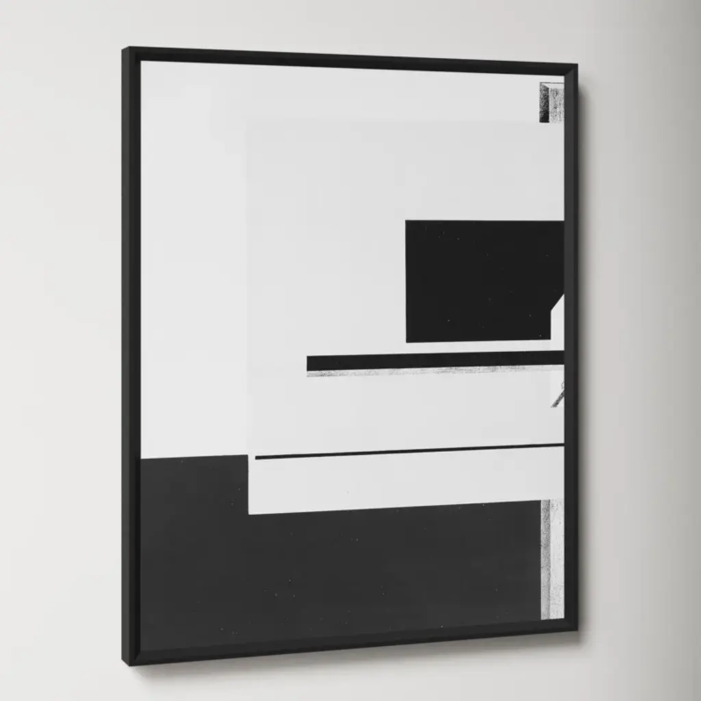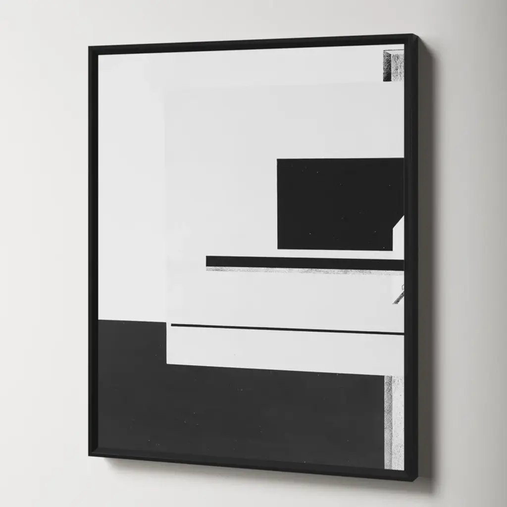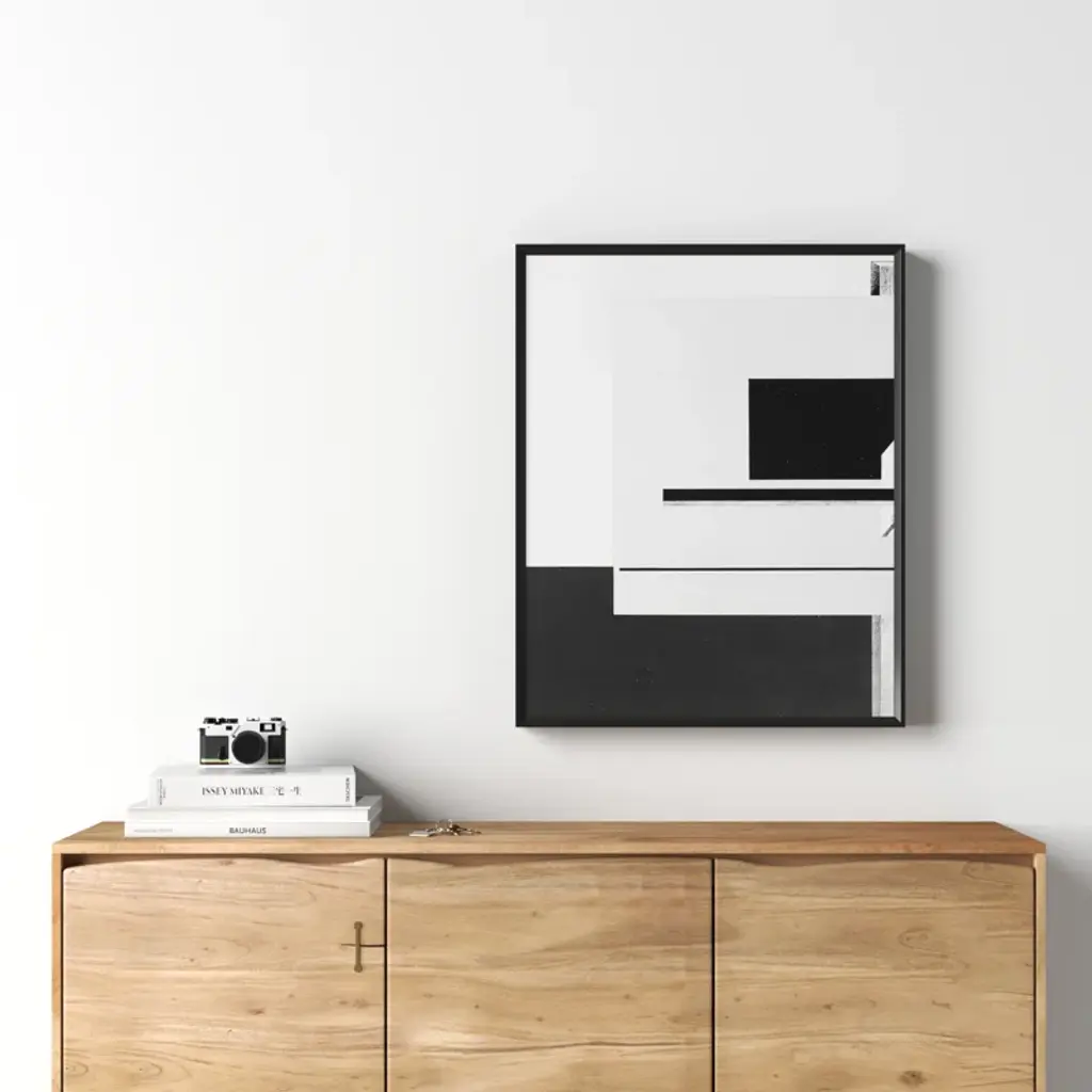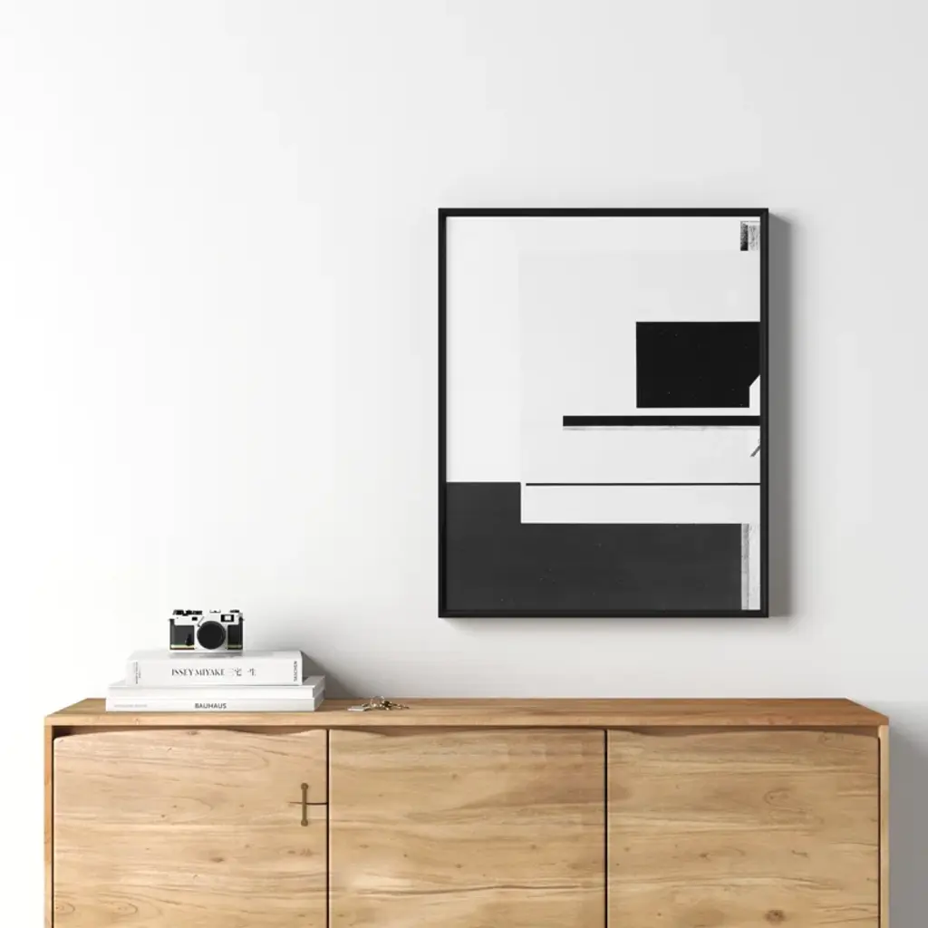 Geometric Study. Stark and architectural, this monochrome graphic print uses negative space + layers of abstract shape to evoke dimension. It’s giclee printed on paper for an accurate, lasting reproduction, and arrives framed + ready to hang.