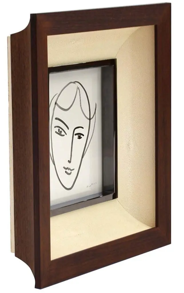 More than a decorative object, this frame will display cherished memories recorded on a photo to be remembered and admired. This elegant frame is crafted of dark wenge and showcases a wide beveled passe-partout covered in ivory shagreen and a smaller metal frame with black nickel to enhance the visual appeal of the displayed picture. Arranged in multiples along a wall in a living room or entryway, this frame will add warmth and timeless appeal into both traditional and modern interiors. The cutout for the picture measures 16 x 18 cm.