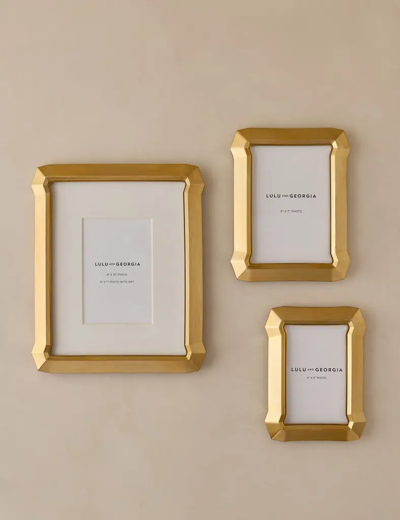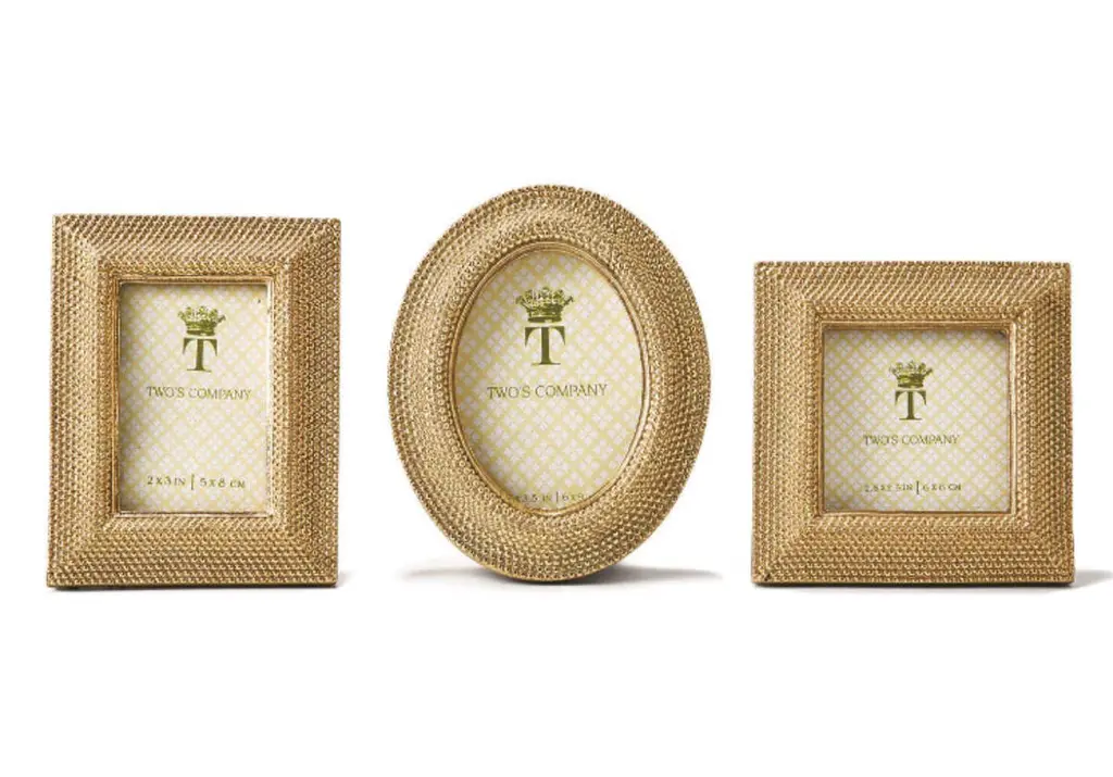 This petite set of picture frames lends an elegant, textured design. Their timeless style displays well on built-ins, vanities, desks, or bookshelves. Sold as a set of three, one rectangle, one oval, and one square frame.