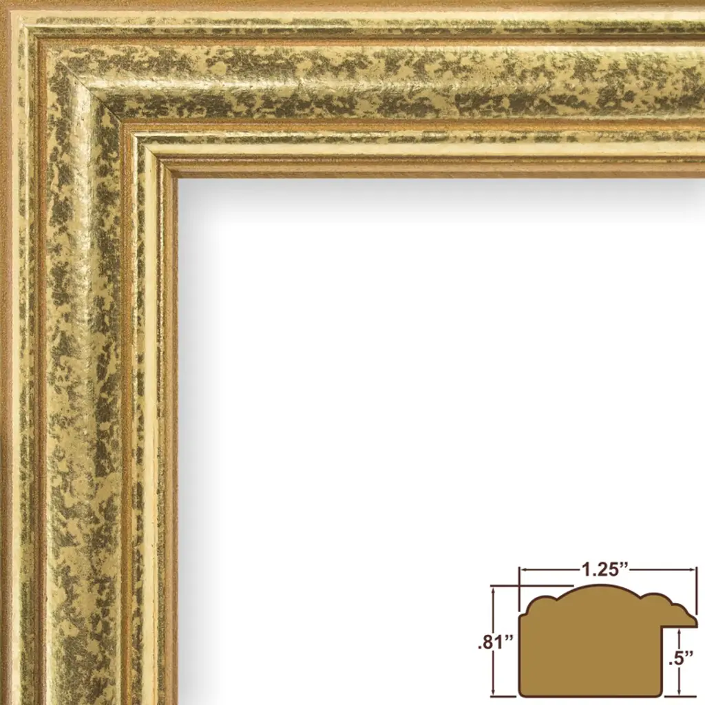 This gold picture frame offers a winning combination of quality, finish and affordability. The Goldstone frame series constructed from poplar features a symmetrical, slightly convex profile. This 1.25" moulding showcases a faux goldleaf finish with painted sidewalls. The timeless, vintage styling of the Goldstone is ideal for a wide range of prints and decor.