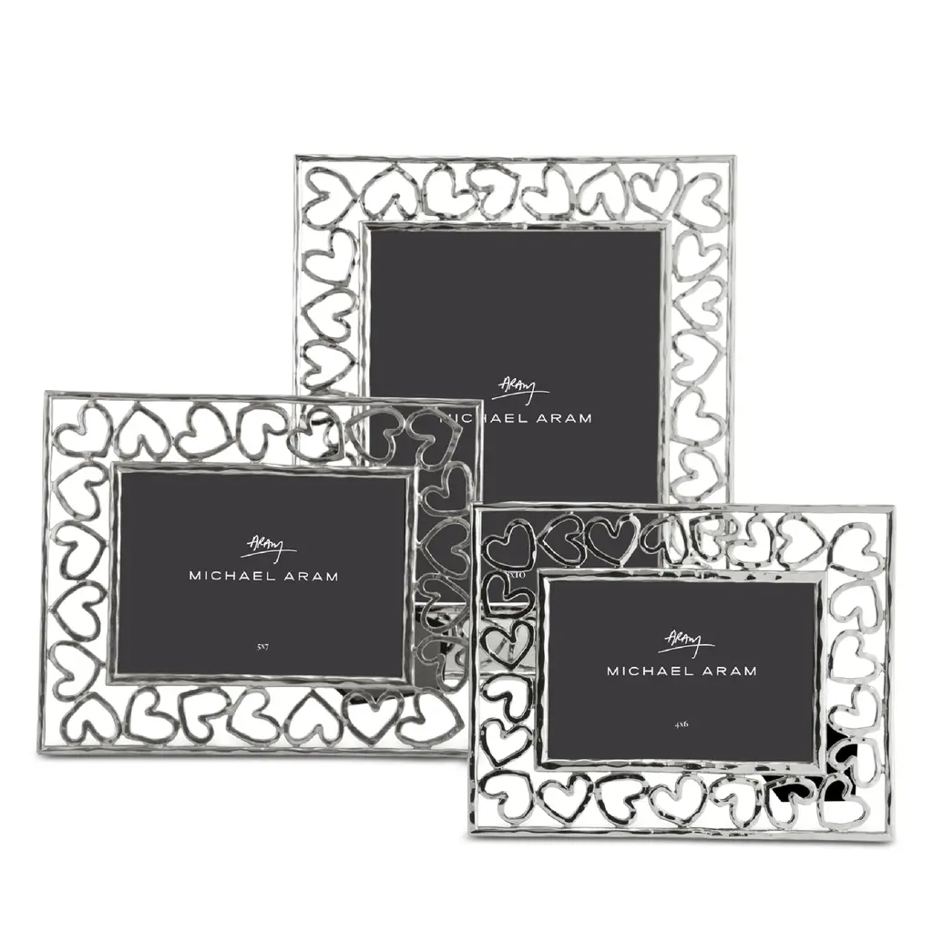 Michael Aram dancing heart photo frames in tarnish resistant silverplate. Ideal for someone you love. The Heart Collection is built around the simple but universal symbol of love, hope, friendship and caring. The shape of the heart creates instant responses in us all and carries a world of meaning that changes according to the intent of both the giver and the recipient.