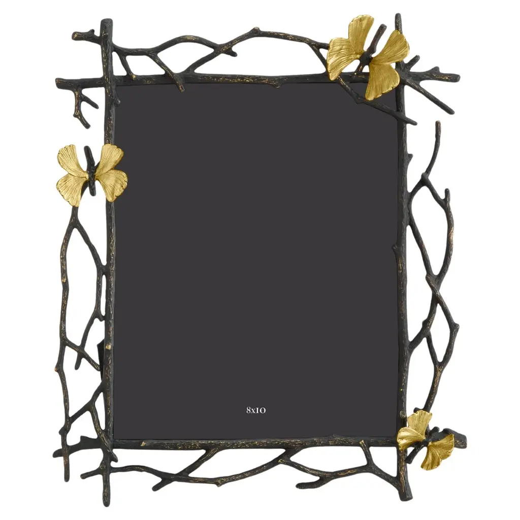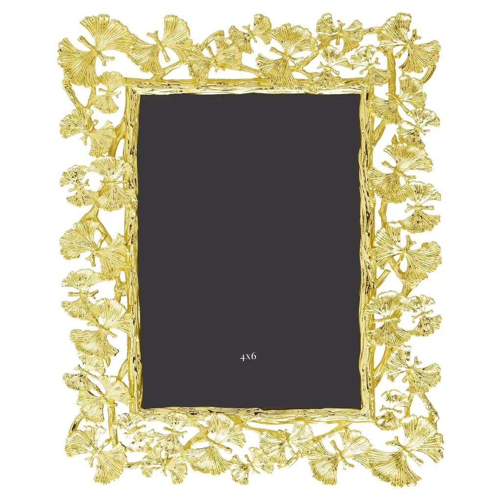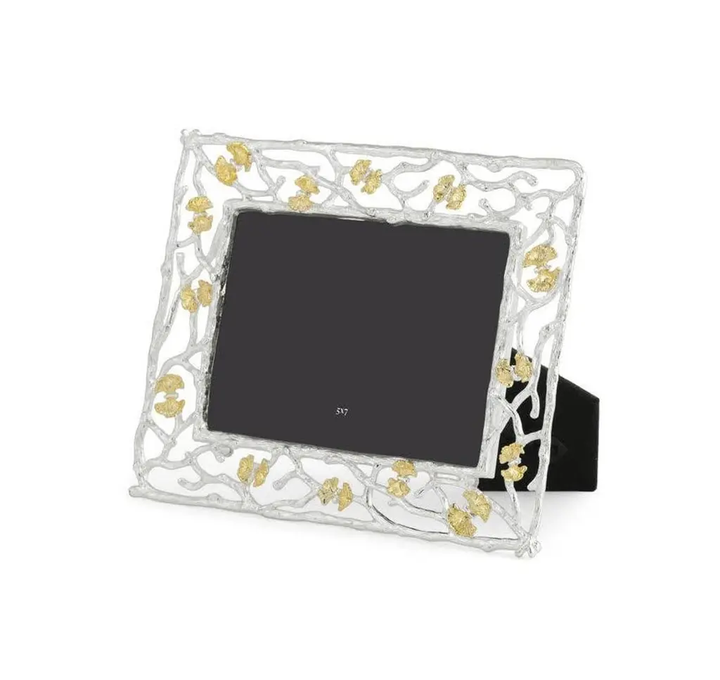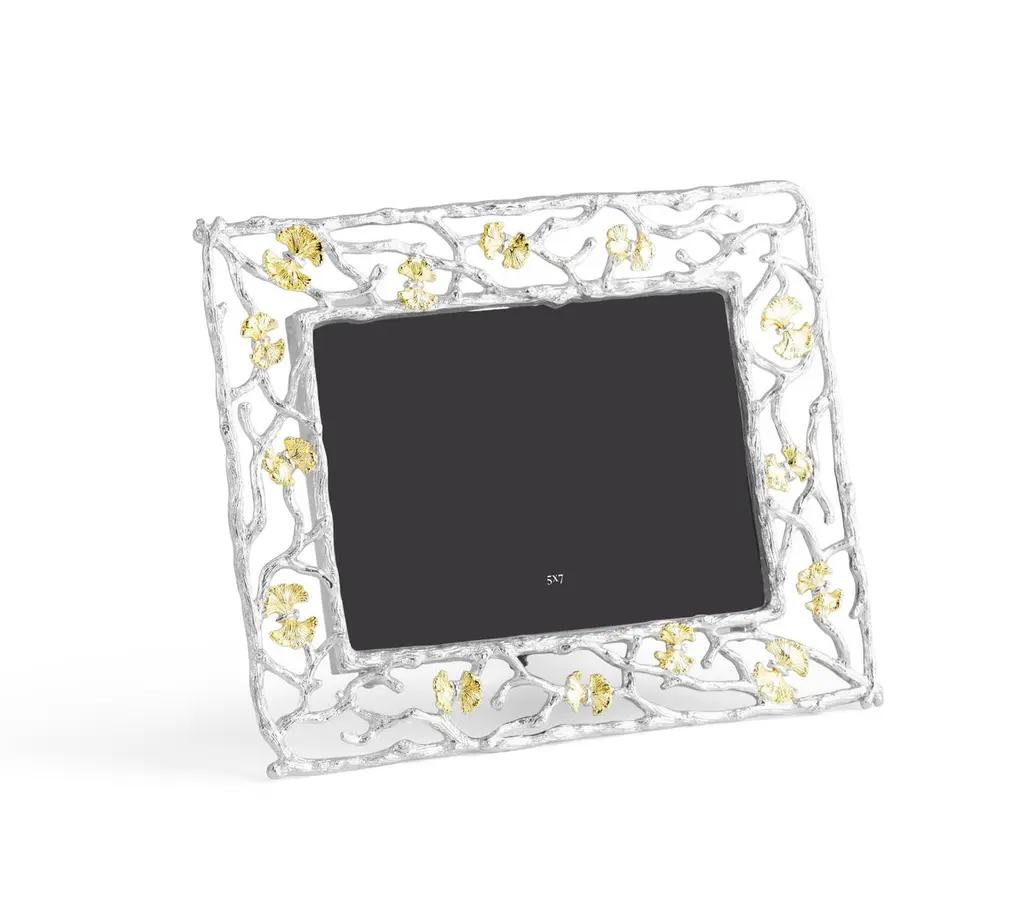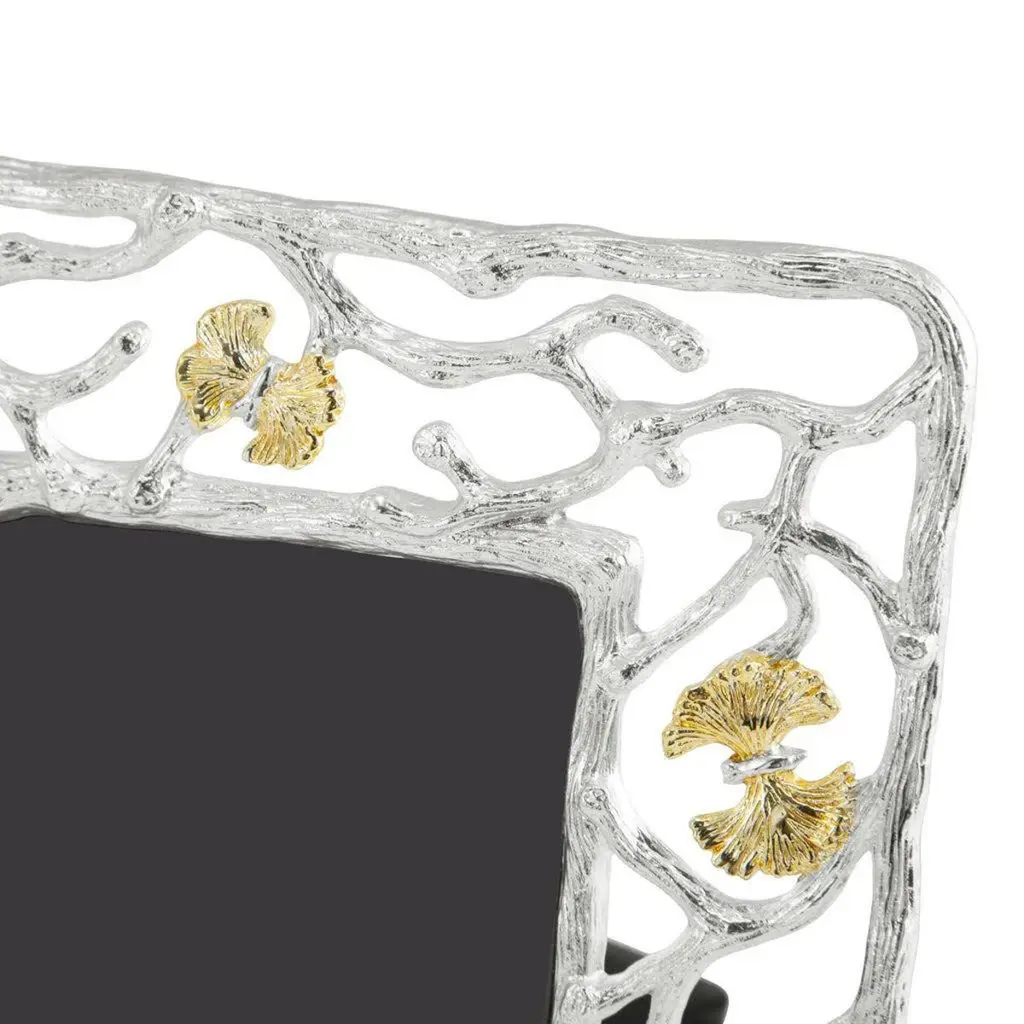 Contemporary, high-quality photo frame with ginkgo and butterfly motif in silver and gold metal.Add a touch of botanical beauty to your home decor with this exquisitely designed photo frame. The frame is adorned with a double gingko leaf motif in gold, reminiscent of a butterfly's wings.Photo frame: H: 24.77 cm, W: 19.69 cm, D: 1.5cmPhoto: H: 17.78 cm, W: 12.7 cm