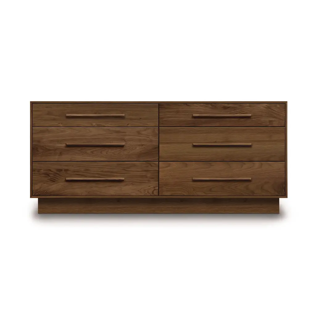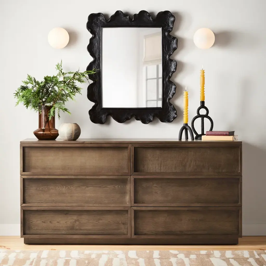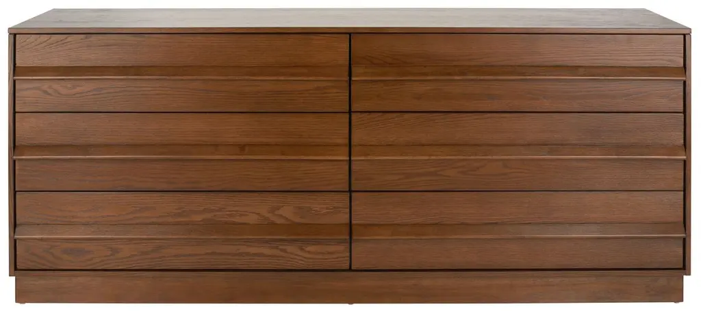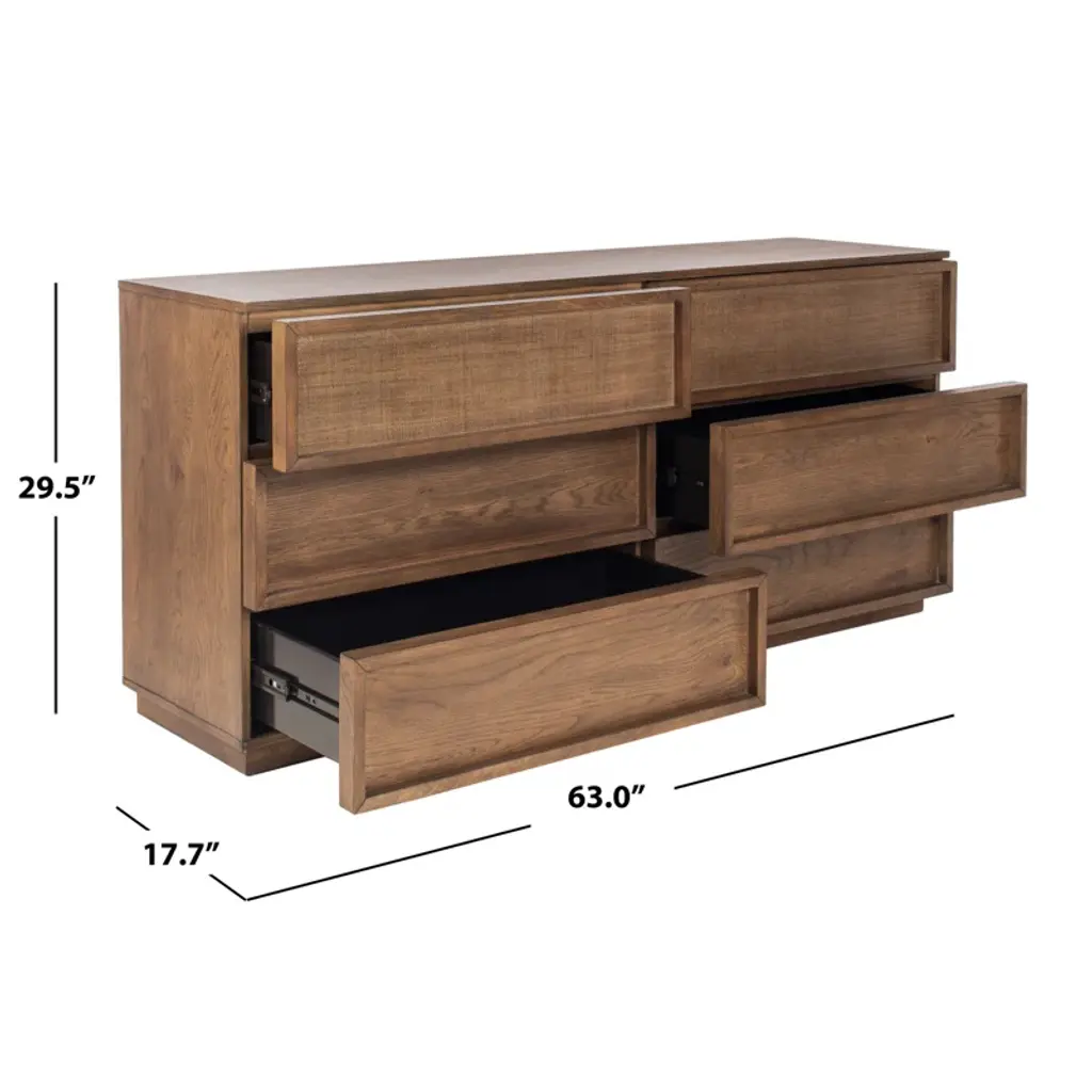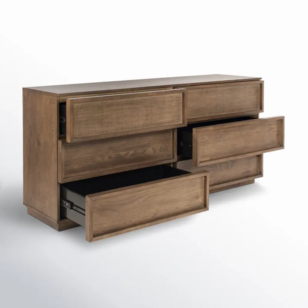 This 6-drawer double dresser offers stylish, streamlined storage. Made from kiln-dried wood, it features a natural wood grain finish. The six drawers glide smoothly on ball-bearing mechanisms, with felt-lined interiors to protect delicate items. Picture frame paneling and a low-platform base add finishing, modern touches. Pair it with other pieces from the matching collection for a cohesive look.
