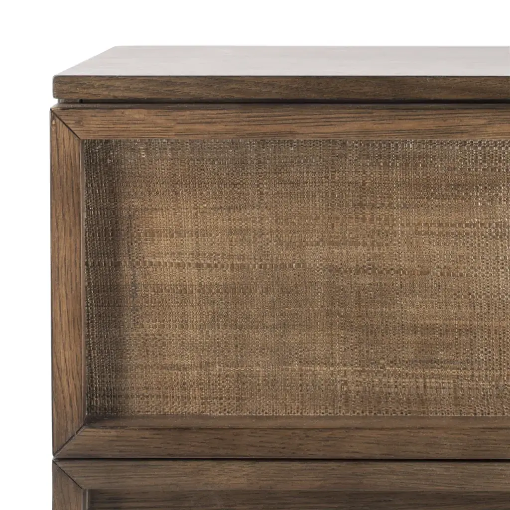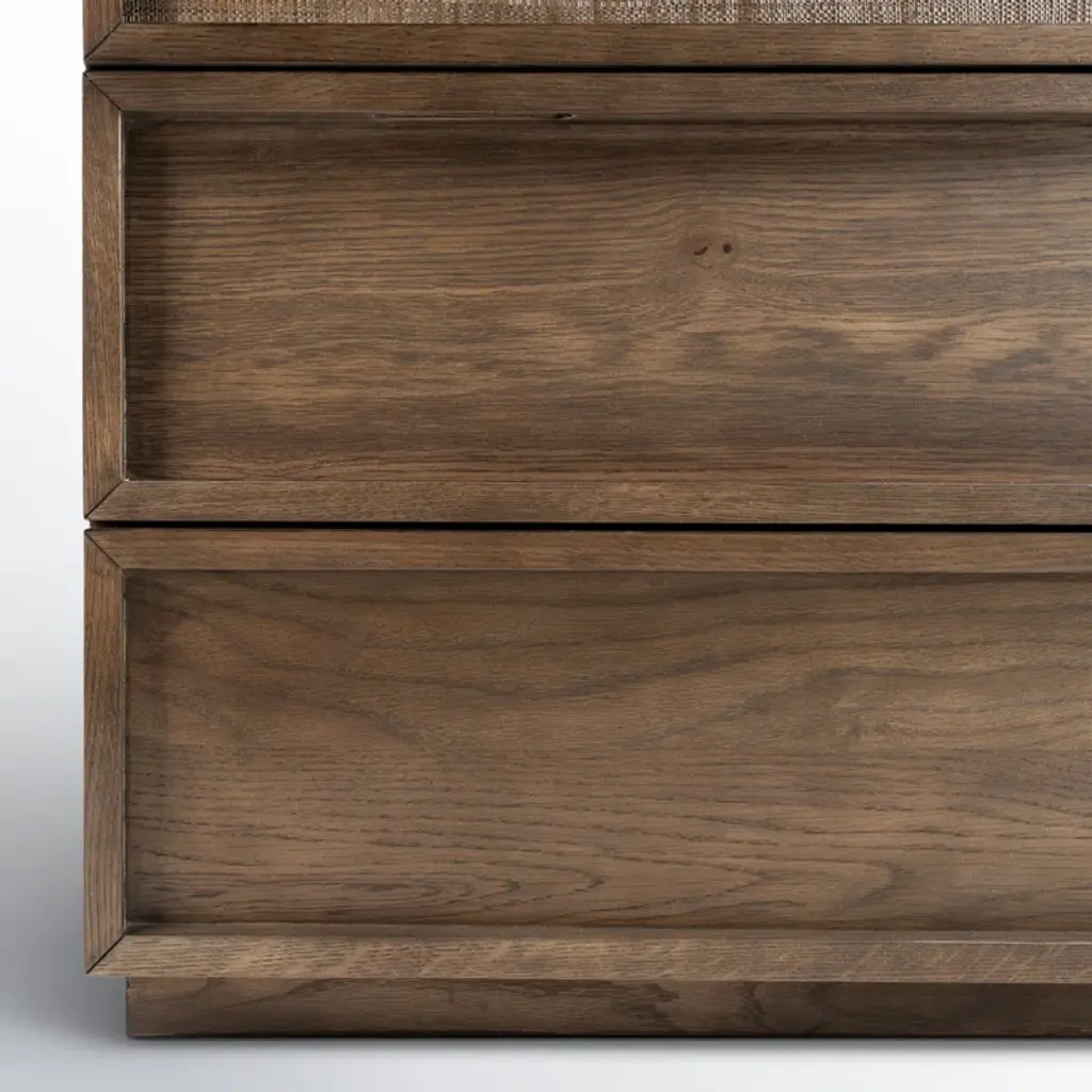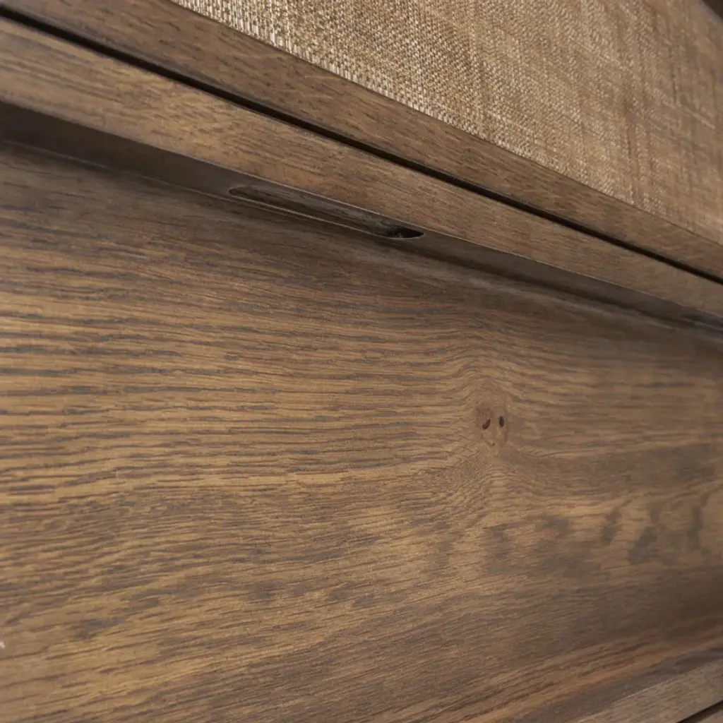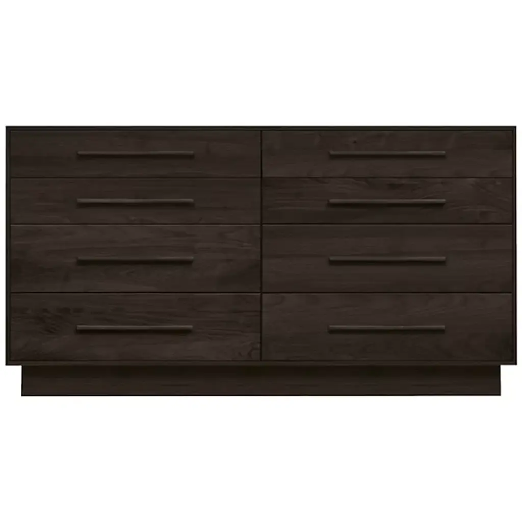 This 6-drawer double dresser offers stylish, streamlined storage. Made from kiln-dried wood, it features a natural wood grain finish. The six drawers glide smoothly on ball-bearing mechanisms, with felt-lined interiors to protect delicate items. Picture frame paneling and a low-platform base add finishing, modern touches. Pair it with other pieces from the matching collection for a cohesive look.