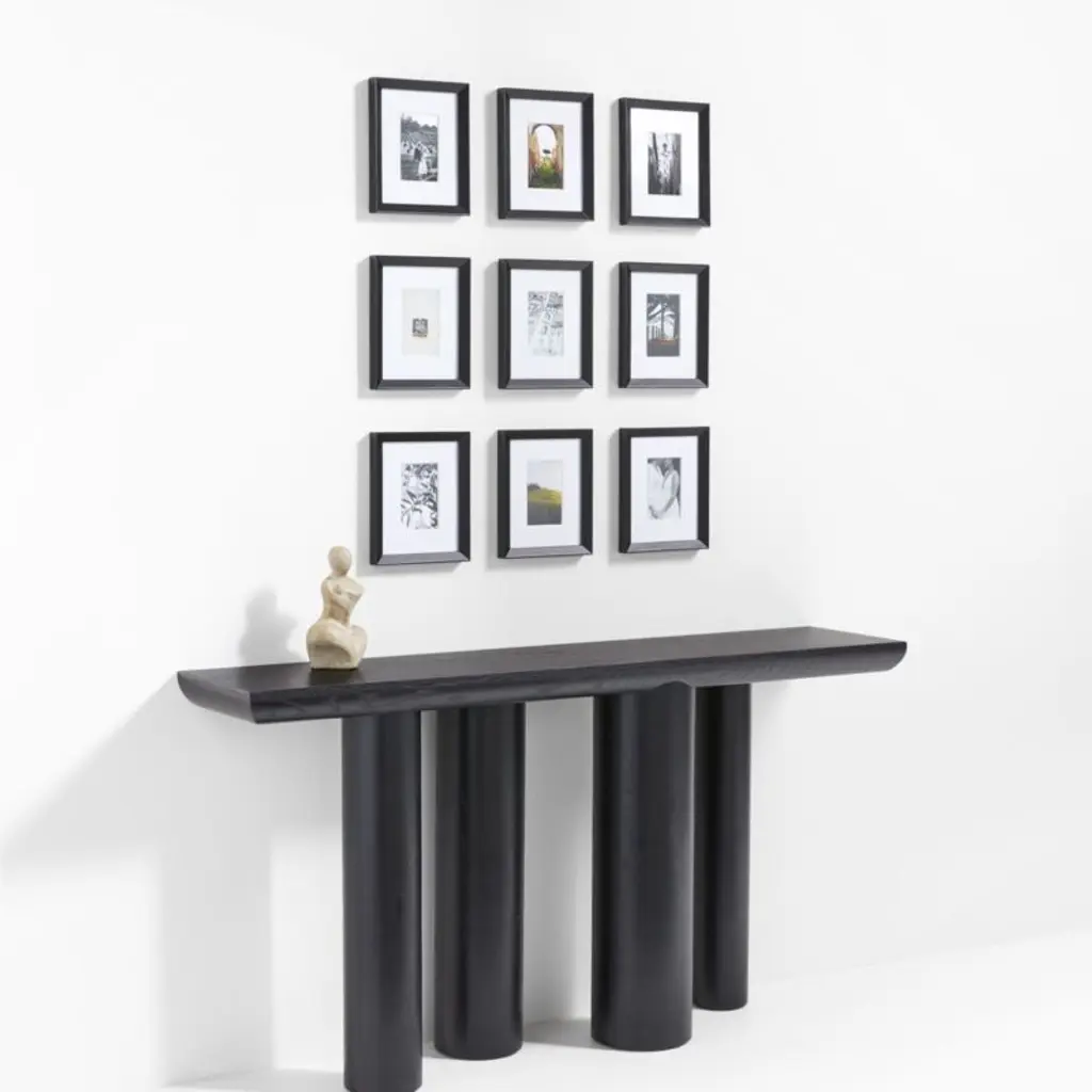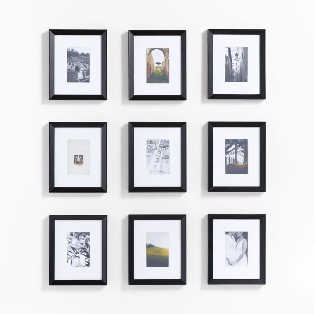 Create an instant gallery with this nine-frame set. The classic frames give treasured photos the presentation they deserve. Thick white mats and beveled black frames elevate the most casual snapshot, and the impeccable proportions and crisp black-and-white perfectly suit modern decor. A Crate & Barrel exclusive, the set of nine 4"x6" wood frames can be displayed in a grid, in a long line down a hallway or arranged as a staggered gallery wall.