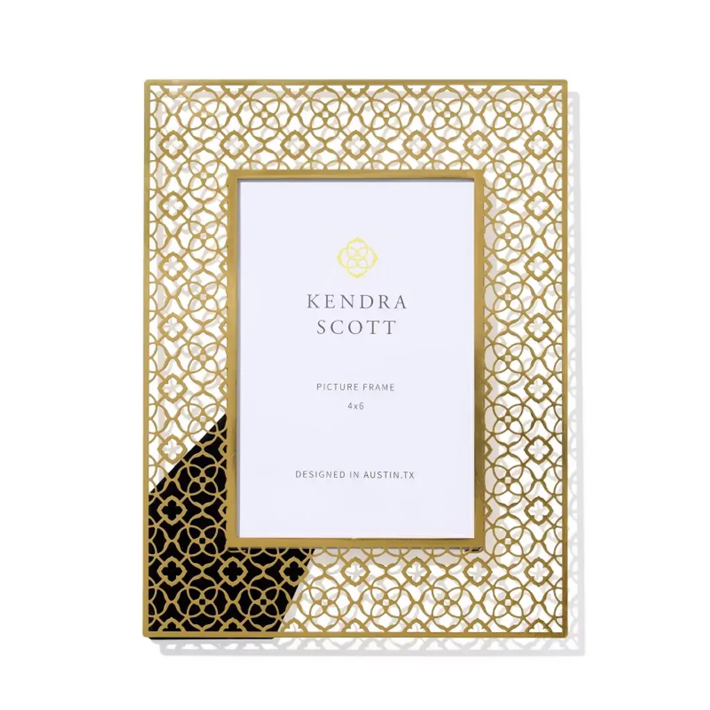 Showcase all your precious memories in the Filigree Metal Frame. Featuring Kendra Scott's iconic medallion logo in a gold filigree pattern, this upscale frame lets you display your favorite moments in style.Kendra Scott is known for its design and material innovation, use of color, and signature shapes, and the exclusive collaboration with Target upholds the same design and materials standards. This collection uses genuine materials, including 14k gold over brass and rhodium over brass alongside natural gemstones, to create styles designed to shine.Designer, founder, and philanthropist Kendra Scott started her eponymous company in 2002, just three months after her first son was born. Her commitment to innovation, quality, customer service, and detail has taken her from a small startup to a billion-dollar brand—and in the process has given back over $65M to local, national, and international causes that serve women and youth.