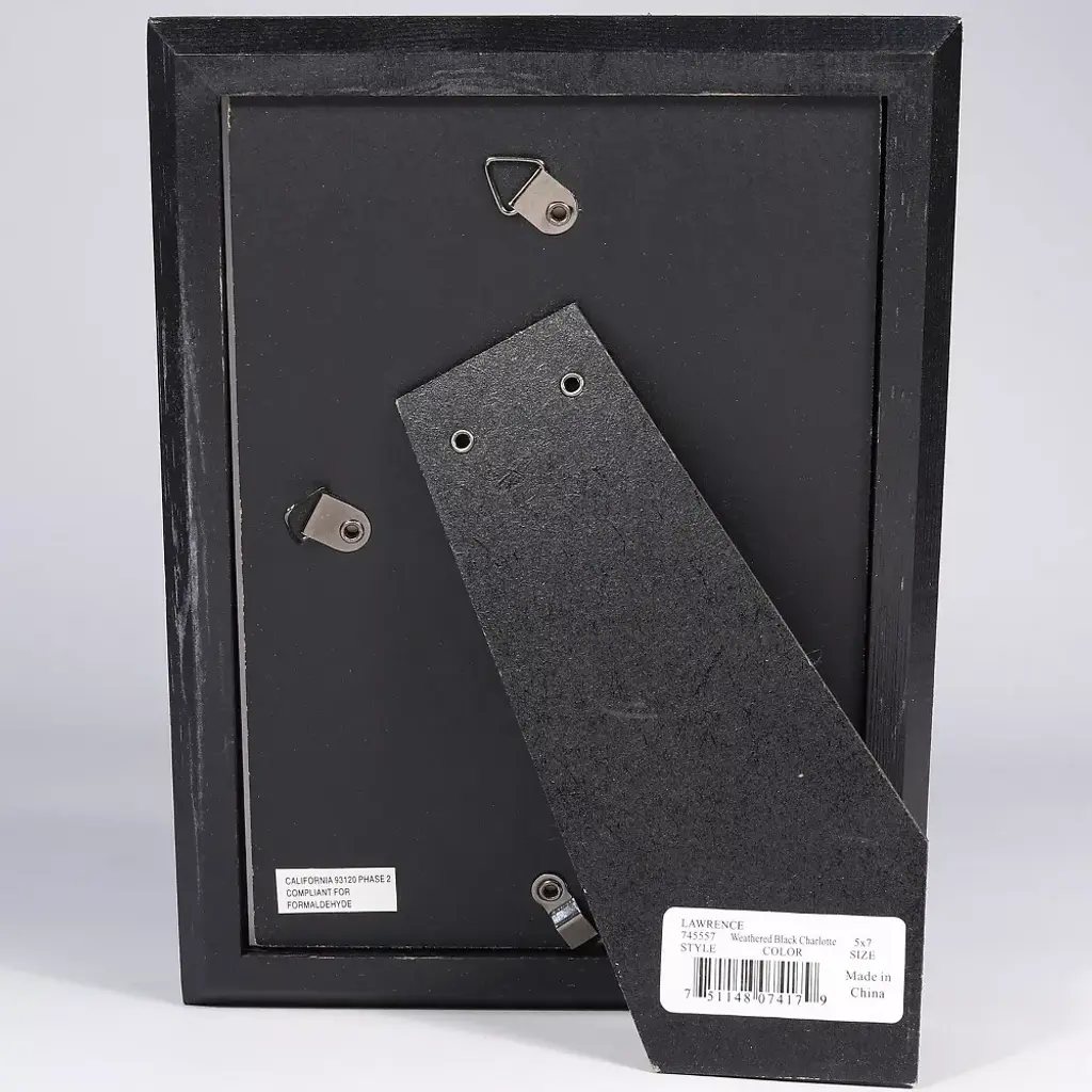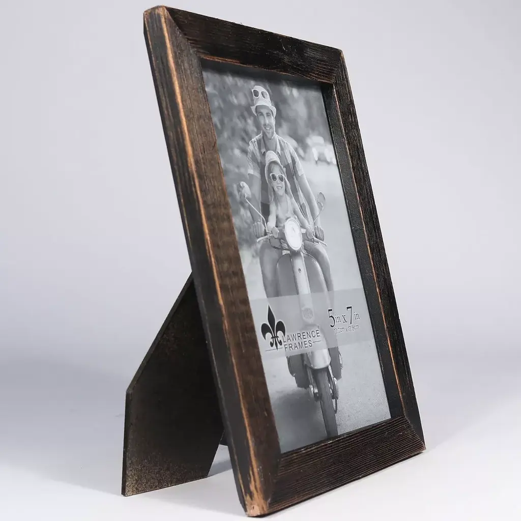 Wonderfully unique weathered black wood picture frame. Each frame is hand finished and weathered which gives this frame a casual and rich look. Included glass to protect your photo. Comes with a quality black easel back which stands both vertically and horizontally. Also comes with hangers for vertical or horizontal wall mooting. Comes individually boxed. Gorgeous weathered black wood finish. Quality easy load black easel backing. Each frame is hand weathered making each piece unique. Comes with hangers for vertical or horizontal wall mounting. Holds a vertical or horizontal 5x7 photo. Sold as 1 Each.