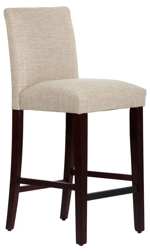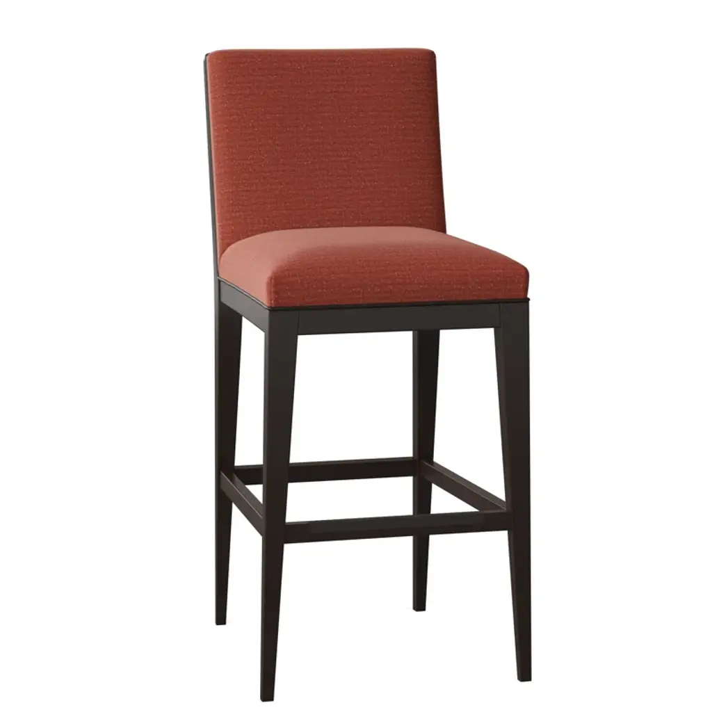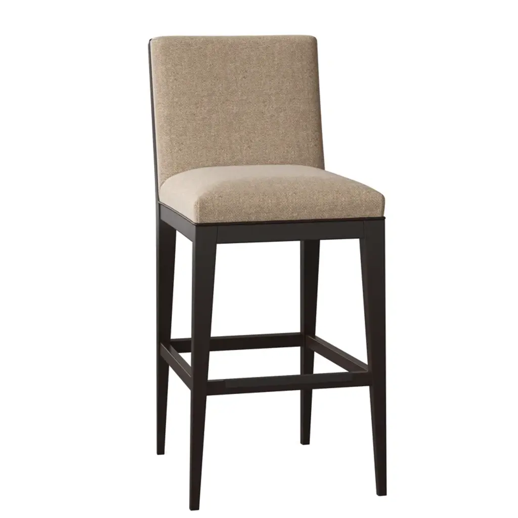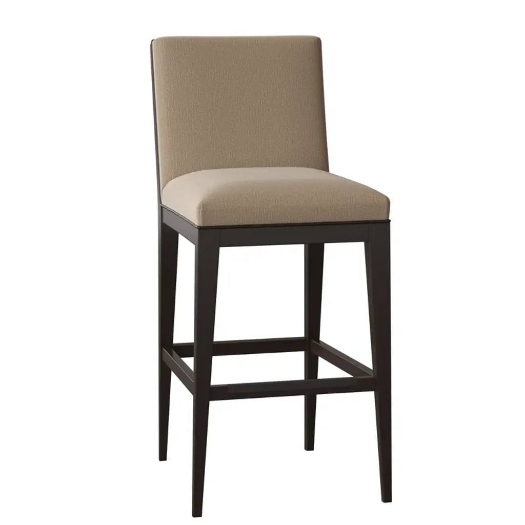 An exposed beech wood frame with a picture frame back is raised on tall tapered legs. The inside back and seat are upholstered.