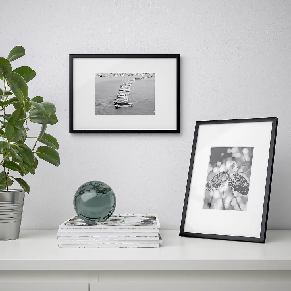 LOMVIKEN Frame - black 8x10 ". This frame is ideal to use with ALFTA adhesive hook. With the hook you can easily hang the frame without nails or screws and decorate your walls with pictures. Can be used hanging or standing, both horizontally and vertically, to fit in the space available.
