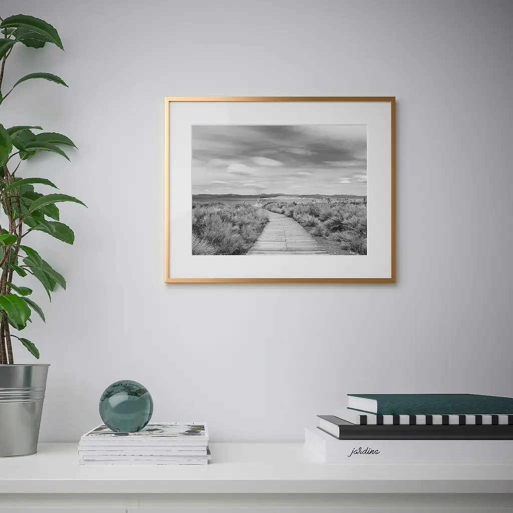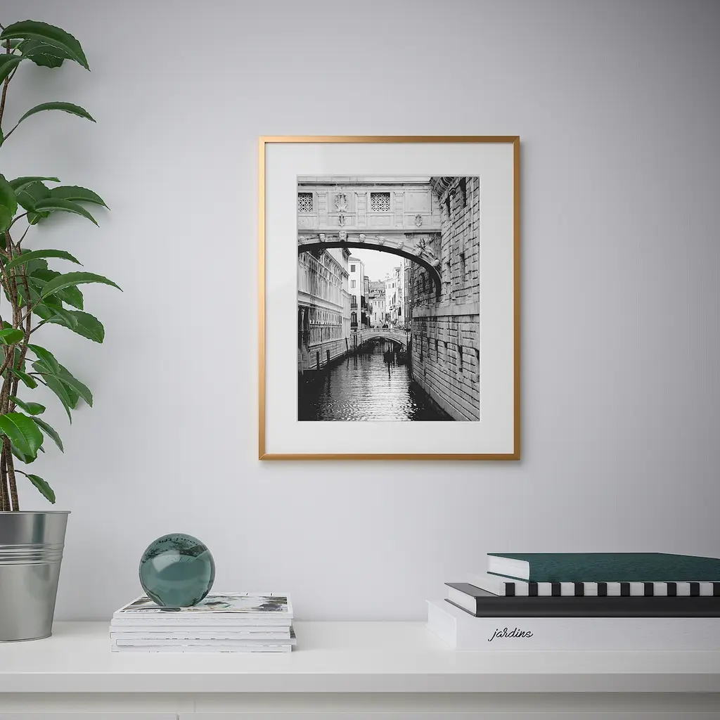 LOMVIKEN Frame - gold 16x20 ". This frame is ideal to use with ALFTA adhesive hook. With the hook you can easily hang the frame without nails or screws and decorate your walls with pictures. The frame can be used horizontally or vertically, whichever suits you or your picture best. Mat included.