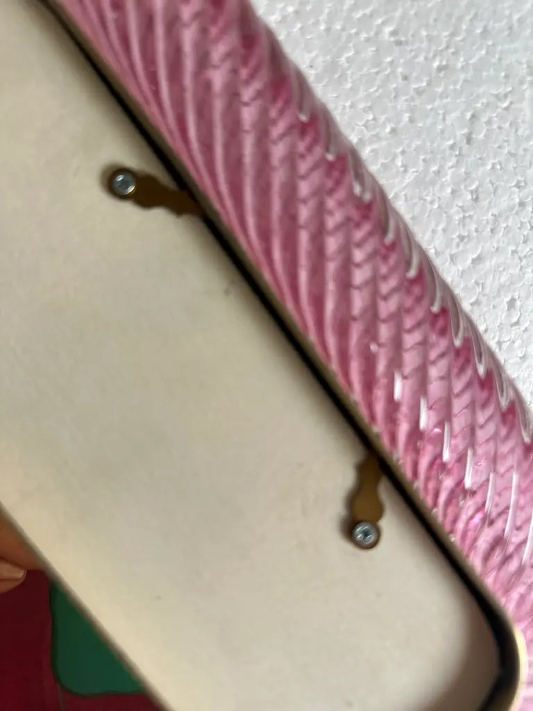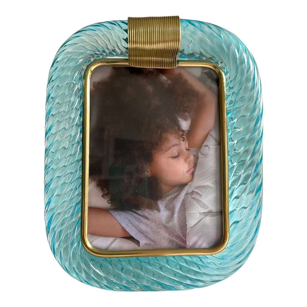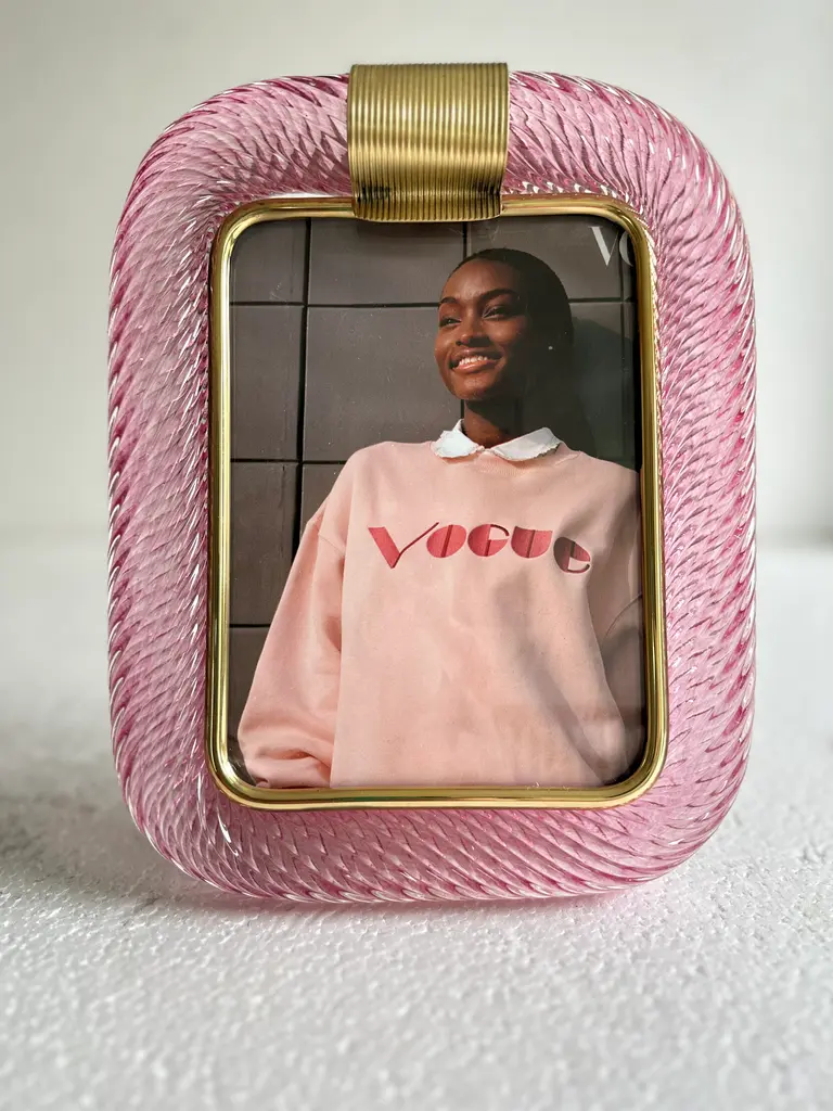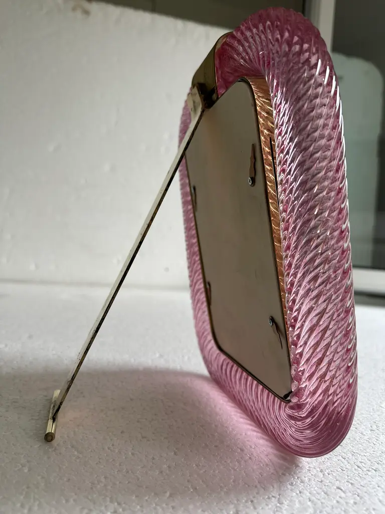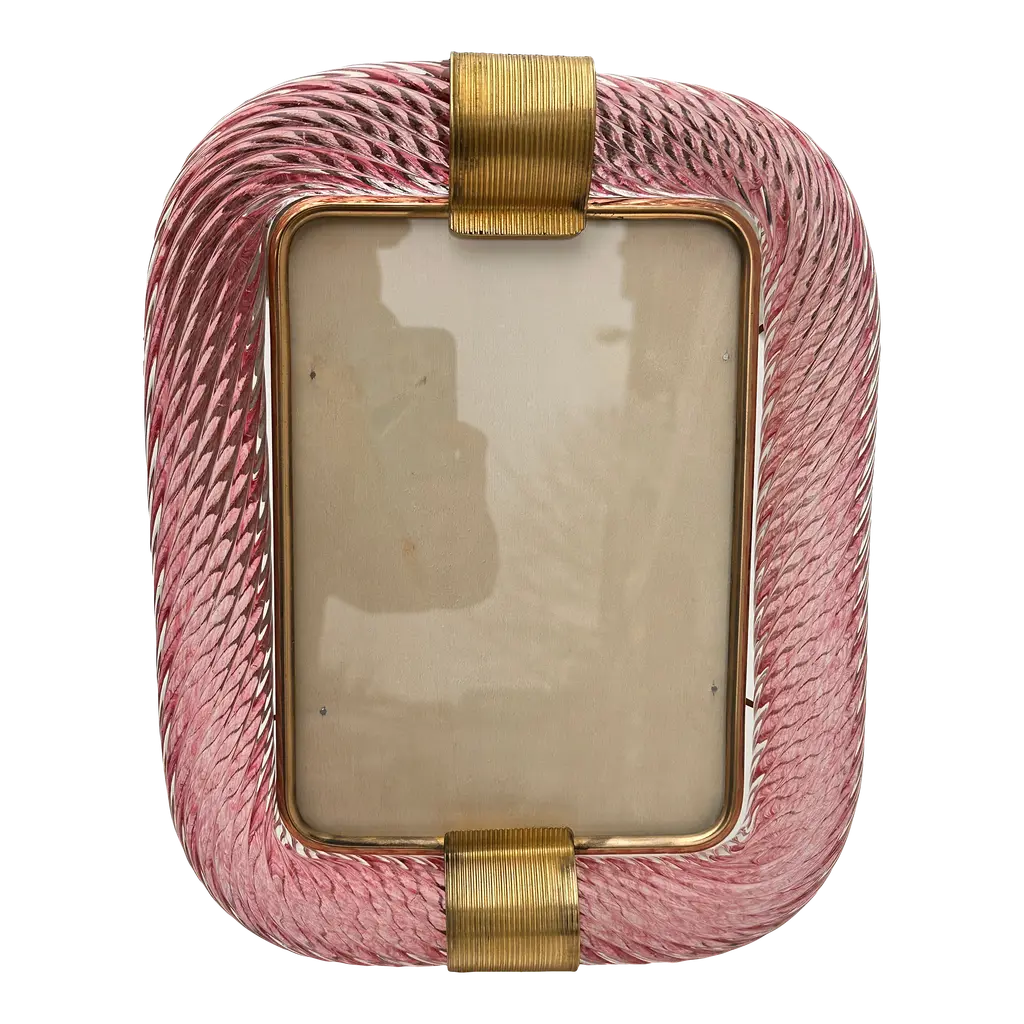 Mid-century modern Luxury pink "Torchon" Murano Glass Picture Frame in Barovier style. Solid Detail in Unaquered brass. A luxury piece of italian art. Pink Murano glass working in traditional tecnique of “torciglione” that give brigtness on glass. All made in Italy, made in Murano glass, ship from Italy in a wood box. L 23cm h28cm sp 15cm /L 9″ H 11″ Sp 6″