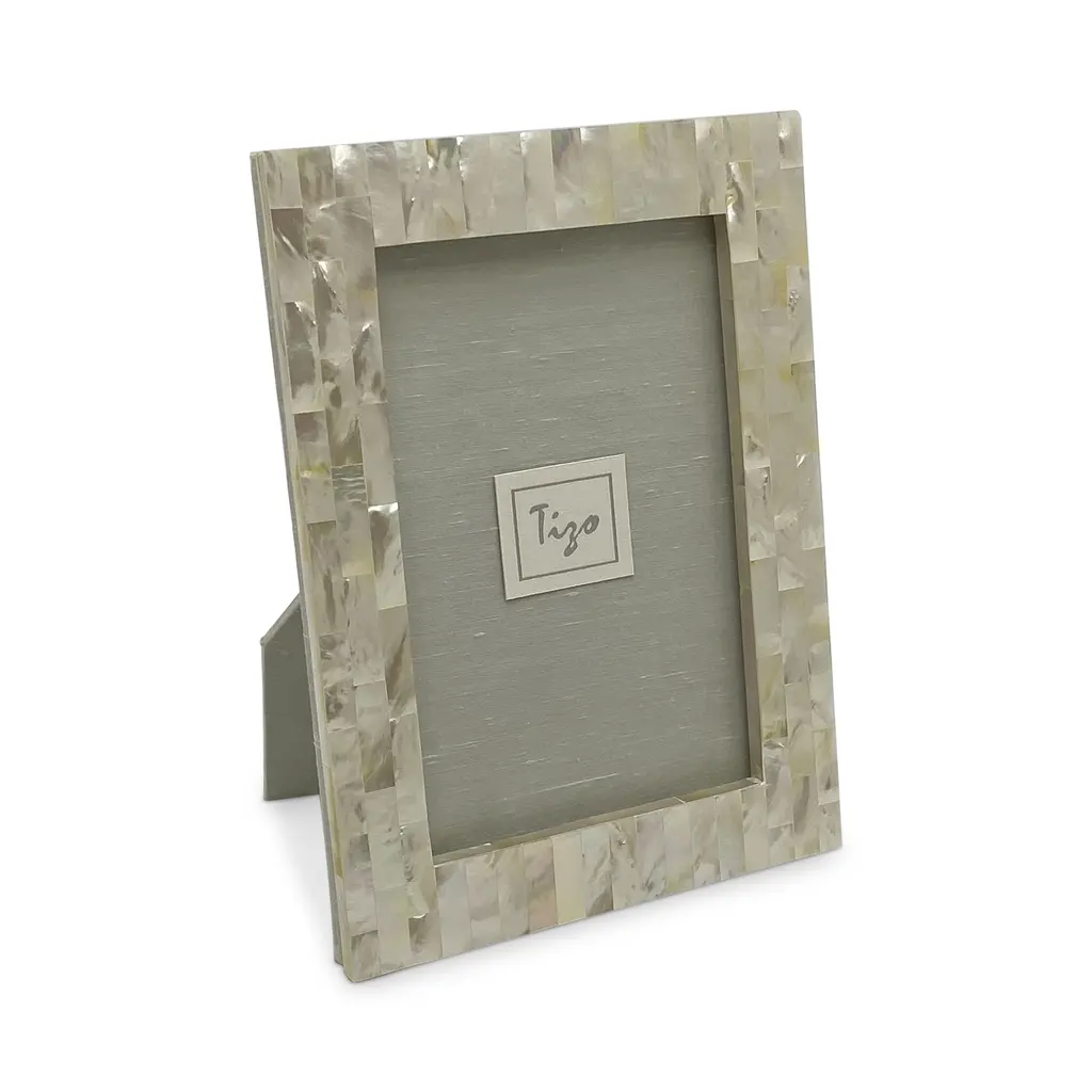 With its elegant design and easel back, the Mother of Pearl frame collection from Tizo Design will display your favorite photographs in iridescent style.