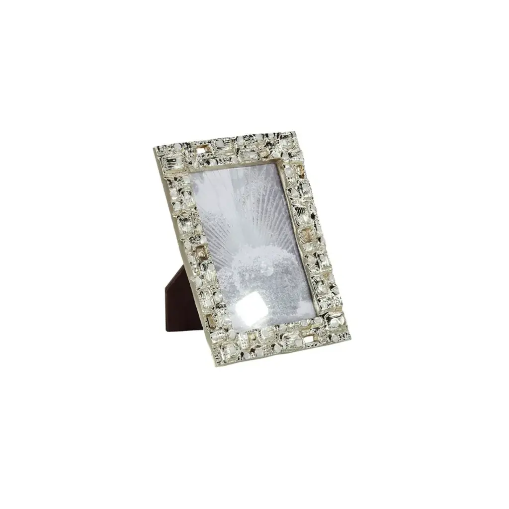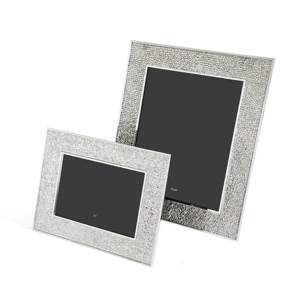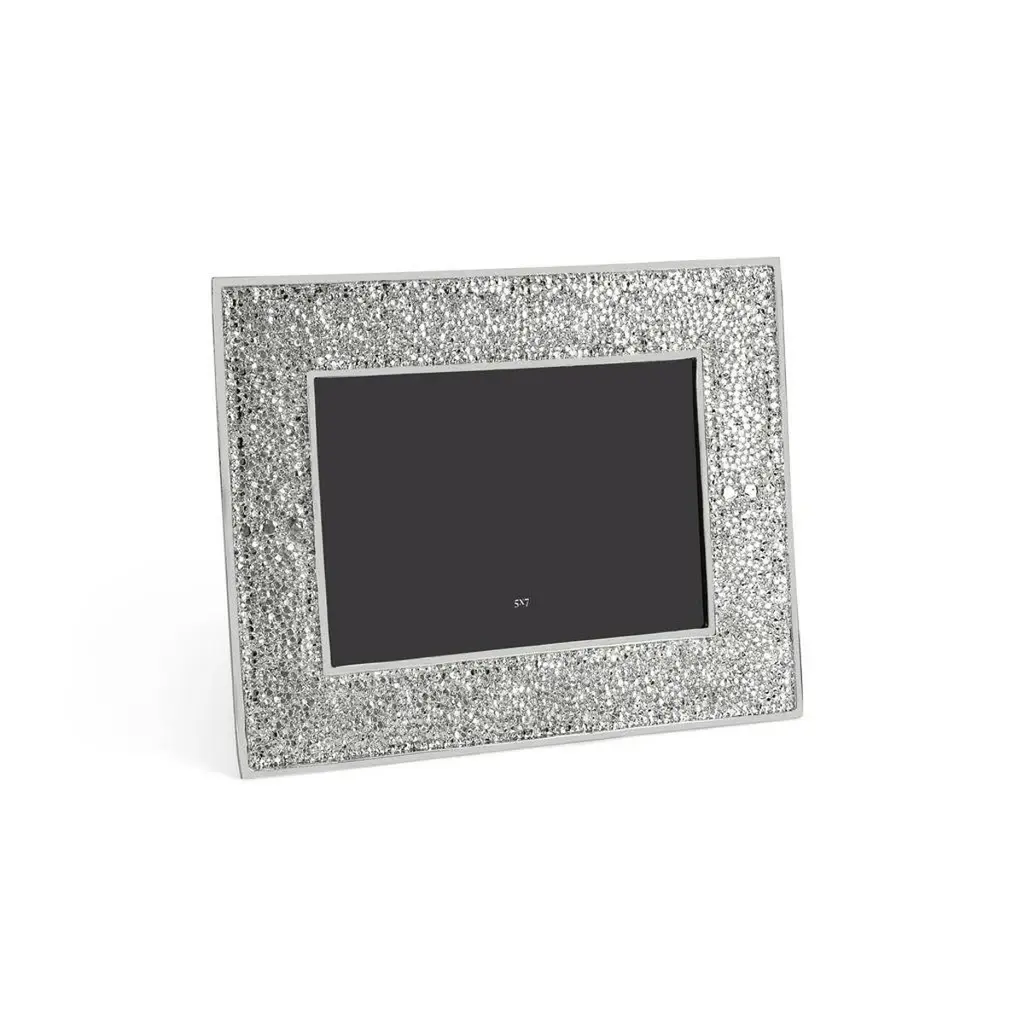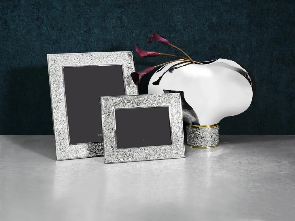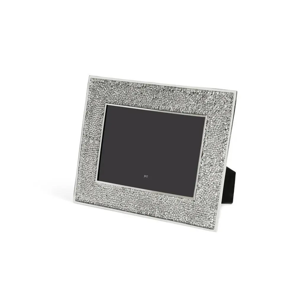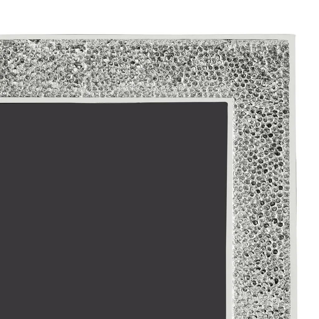 Nickel-plated metal frame imitating shagreen - hand-forged nickel-plated sharkskin-style photo frame with matt finish.Description:The Shagreen Collection interprets the subtle shimmer and grainy texture of natural stingray leather, offering a refined visual vocabulary. The shimmering surface of these pieces will elevate each of your everyday moments.The contrast of shiny metals and matt surfaces creates iridescent tones that connote a sense of celebration. Each piece is hand-forged after casting, allowing the surface to sparkle and shine radiantly.Key Features:Elegant Design: Inspired by the subtle shimmer and grainy texture of natural stingray leather, this frame offers a refined and sophisticated aesthetic.Hand Forged Craftsmanship: Each piece is meticulously hand forged after casting, resulting in a unique glittering surface that shines in any light.High Quality Material: Made from high quality nickel plating, guaranteeing durability and a luxurious finish.Decorative Accent: The Shagreen Collection adds a touch of elegance and celebration to any room, making everyday moments special.Frame Size: H: 19.05 cm, W: 24.13 cm, D: 1.5cmPhoto Size: H: 12.7 cm, W: 17.78 cm