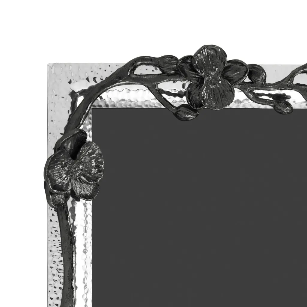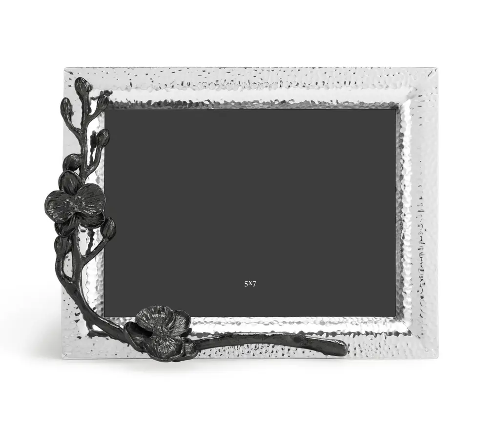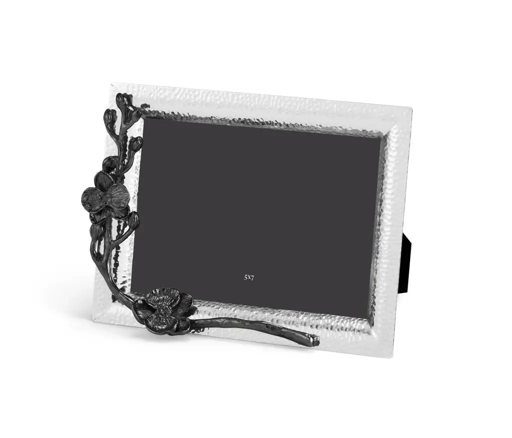Nickel-Plated Metal Medium Photo Frame With Overlapping Black Orchid Design.