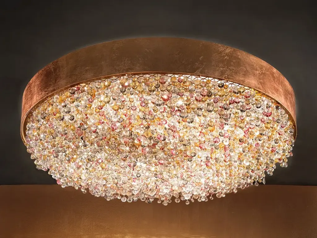 Olà PL6 90 is a ceiling lamp made of metal with crystals.Electrical characteristicsSTANDARD: 8XE27X20W (NOT INCL)CEETLLED DOWN: LEDX31,2W CRI>95 3000K 3072LMLED DOWN: LEDX31,2W CRI>95 2700K 2928LMDIMMABLE: 1-10VCE LEDETL LEDCCC LEDCB SCHEME LEDPowder coated metal frame, coated italian-glass pendants. Available in 7 different finishings: matt white frame comes with cold colours pendants, gold leaf frame comes with amber colours pendants, silver leaf frame comes with transparent pendants, copper leaf frame comes with copper colours pendants, matt bronze frame comes with warm colours pendants or burnished frame comes with amber colours pendants, matt blake with smoky pendants