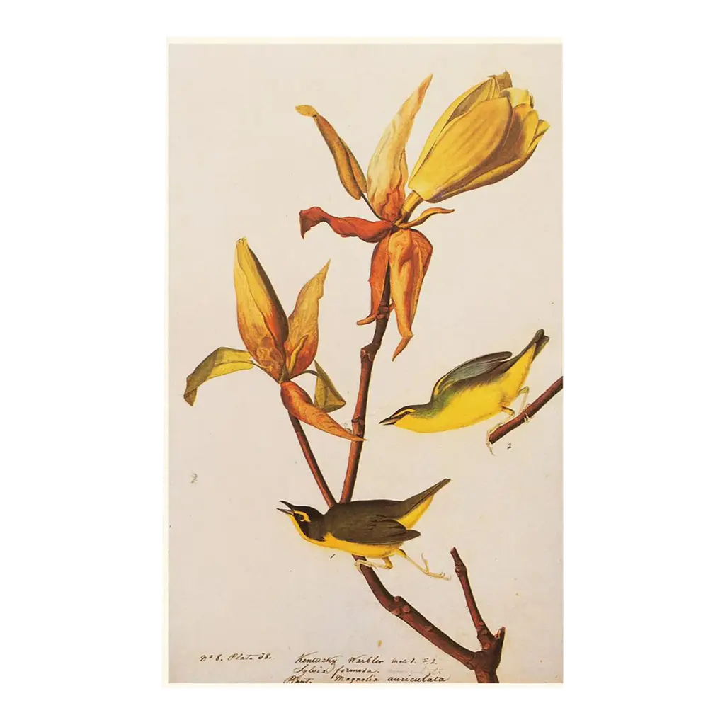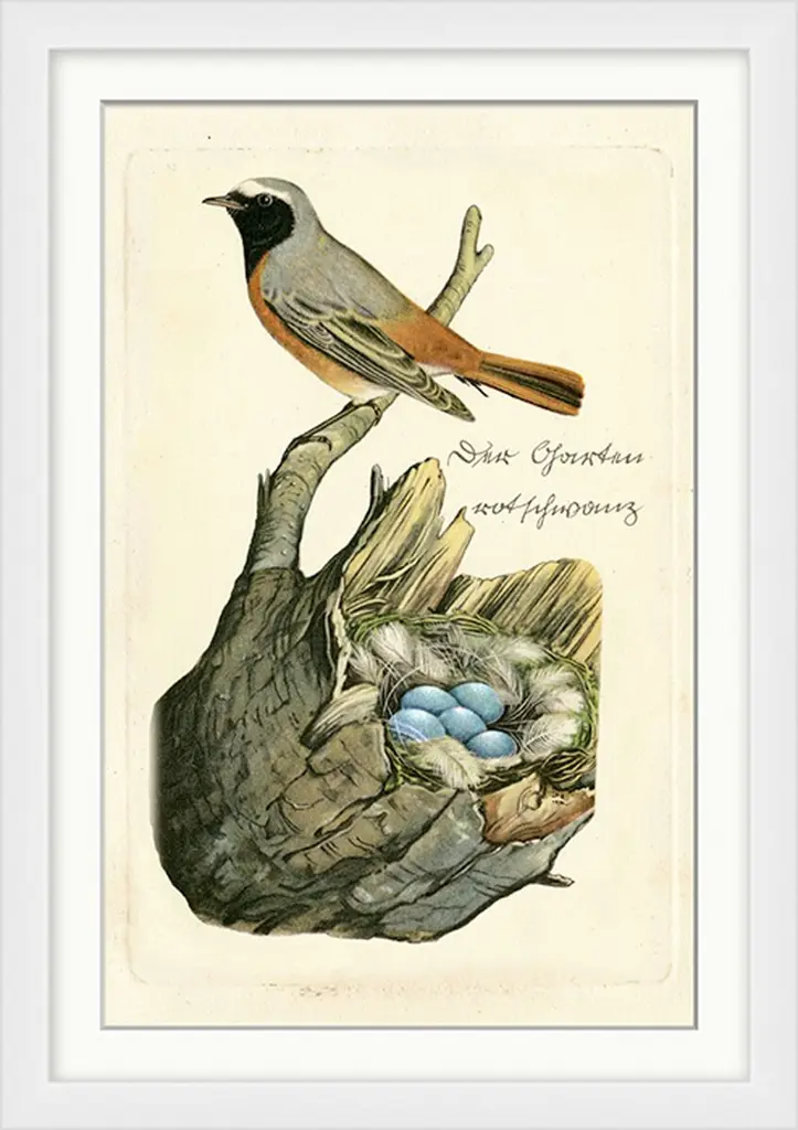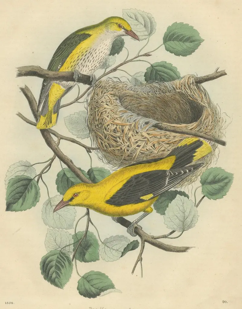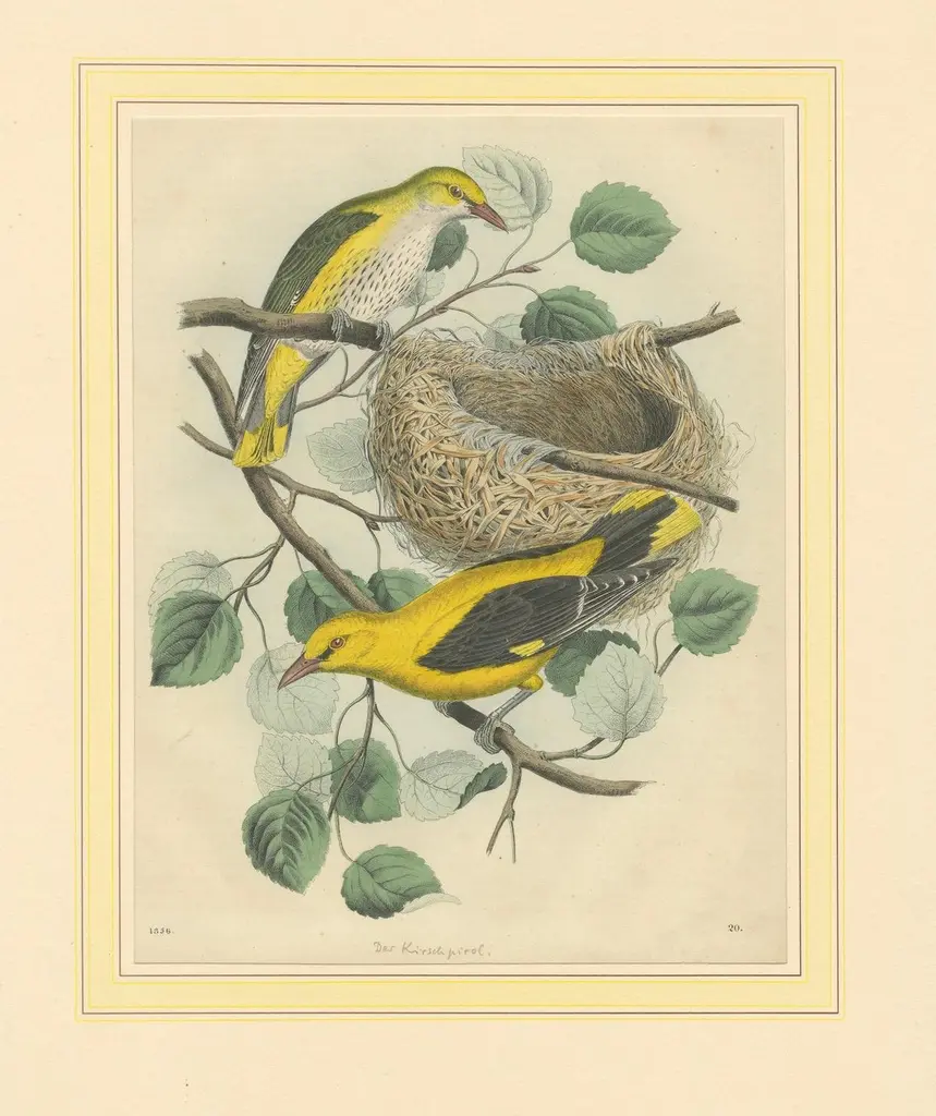 Pair of Golden Orioles and Nest on a Branch, from Book of Worlds, 1856This exquisite hand-colored ornithological print, titled "Der Kirschpirol" (The Golden Oriole), was published in 1856 as part of the German natural history series Book of Worlds. The illustration features two beautifully rendered Eurasian Golden Orioles (Oriolus oriolus) perched near their intricately woven nest, suspended delicately among leafy branches. The male, in vibrant yellow with contrasting black wings, is seen at the lower center, while the more subtly colored female, with greenish tones and streaked underparts, rests above. Their alert posture and the precise depiction of the nest suggest the height of nesting season, likely spring or early summer.Attributed to a tradition of fine 19th-century German naturalist illustration, this print is exemplary of the intersection between scientific observation and artistic refinement. The lithograph not only serves as an accurate zoological study but also as a decorative work of art. The attention to detail in the plumage, foliage, and nest construction highlights the illustrator's commitment to realism, characteristic of the period's best ornithological works.This piece comes from the rare publication Book of Worlds (1856), a lesser-known but richly illustrated work dedicated to the natural diversity of Earth. Its inclusion of birds, plants, and other fauna makes it an invaluable collector’s item for those interested in 19th-century natural history documentation. The text beneath the image includes the German name and the print number 20, with the year 1856 engraved in the lower margin.Condition Report:Good overall condition with only minimal foxing in the margins. Vibrant original hand-coloring remains fresh and detailed. Edges clean with no visible tears. Slight age-toning appropriate for 19th-century paper.Framing Tips:Best framed with a double mat: a pale cream outer mat with a narrow golden yellow inner mat to echo the bird’s plumage. A natural wood or gold-leaf frame will enhance its antique appeal and preserve its historical character. Use UV-protective glass.