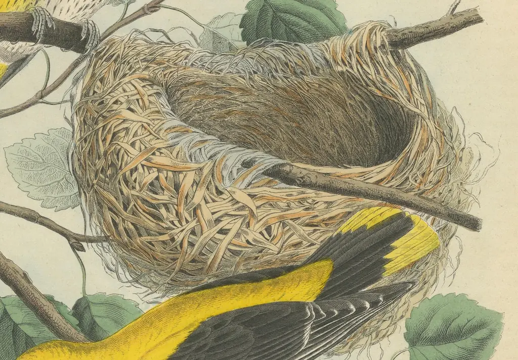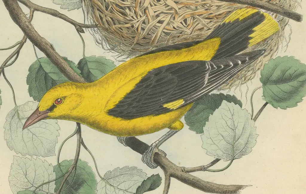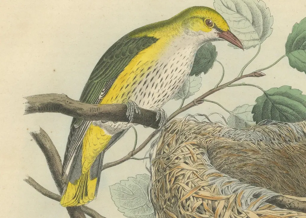 Pair Of Golden Orioles And Nest On A Branch, From Book Of Worlds, 1856