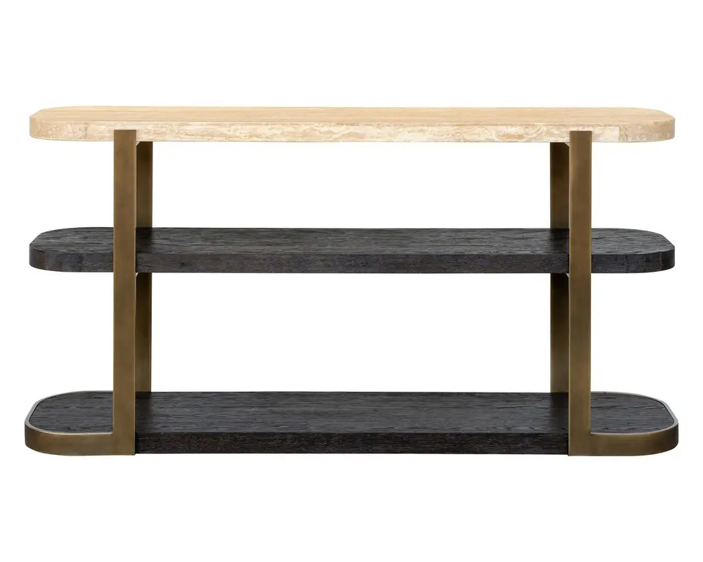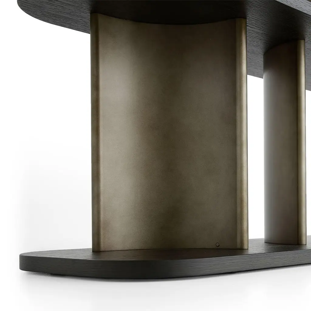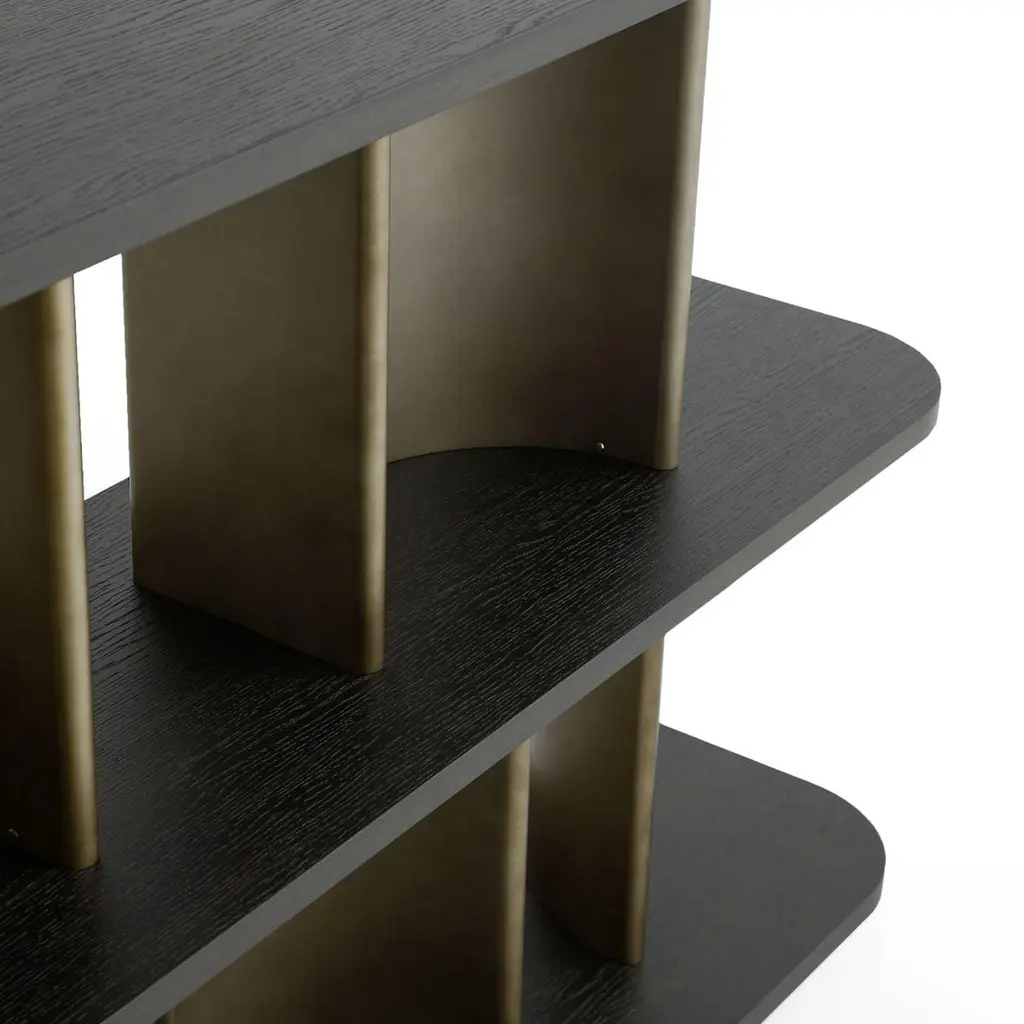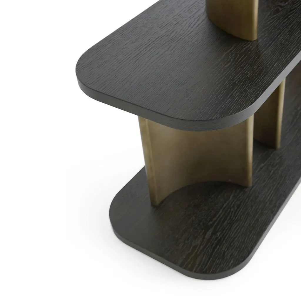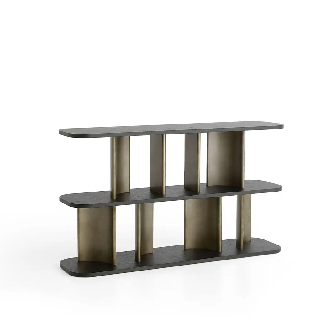 Curved burnished-lacquered and oxidized wooden inserts immediately characterize this bookcase's stylish and seductive design. Its charm is enhanced by the Laguna durmast shelves that, perfected by a water-based patina, make for an elegant solution to display books together with photo frames or collectibles. It is also available in a different-sized variant.