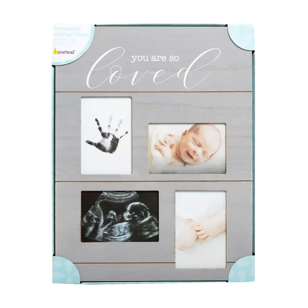 You are so loved. Capture and cherish your little ones print forever with Pearhead’s so loved photo frame. This rustic gray, wooden frame includes everything you need to create a personalized keepsake with your newborn’s tiny print. It includes a clean-touch ink pad ensuring baby’s hand or foot will never touch the ink! To create an impression, make sure the ink is facing down on the included white card and press your baby's hand or foot onto the clean-touch ink pad. Your baby’s tiny print will be left on the card without any ink on baby! The clean-touch ink pad can be used at most two-times. For newborns only. Ink pads will accommodate hand/feet up to 2.25” wide x 3.5” long. Let dry for 1-2 days. Then you can place the print in the frame along with 3 adorable 4” x 6” photos of your newborn baby. The frame includes “you are so loved” printed in white adding that extra special touch. It also includes a sawtooth hanger and easel to easily hang on any wall or sit on any shelf in your baby’s nursery. This frame is the perfect baby shower gift for any expecting parents! Now you will always be able to remember how little your baby's piggies were and cherish them with Pearhead’s so loved photo frame.