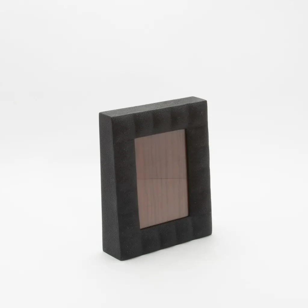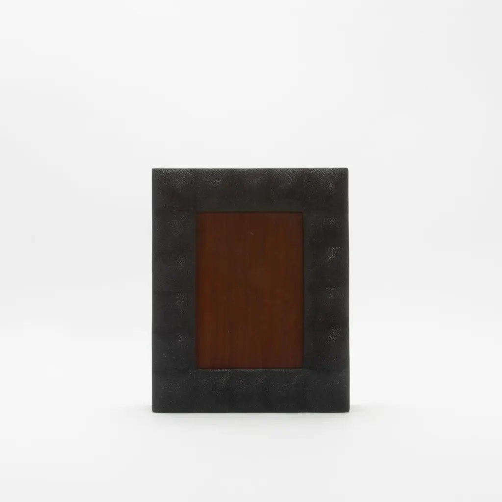 This luxurious picture frame by R&Y Augousti is crafted in their signature quilted black shagreen, exuding both timeless elegance and modern refinement. The tactile texture of the shagreen finish contrasts beautifully with the smooth glass window, framed meticulously with hand-finished details. The rich wood backing provides a sophisticated depth, complementing the opulent materials while ensuring the frame is as functional as it is striking.This item is on display in our LA showroomColor variants may occur on the stingray and other exotic finishesClean with soft dry clothAbout R&Y AUGOUSTI:R&Y Augousti, created by the visionary husband-and-wife duo Ria and Yiouri Augousti, epitomizes the pinnacle of luxurious, globally inspired design. Since its inception in Paris in 1989, the brand has become synonymous with opulence, distinguishing itself through the masterful integration of shagreen with brass and other exotic materials. Each piece in their Art Deco-inspired collection is a testament to unparalleled craftsmanship, meticulously handcrafted by the finest artisans in the Philippines, ensuring that every creation is a unique masterpiece.Ria, hailing from Manila, and Yiouri, from Cyprus, share an exquisite passion for revivalist design, which has propelled R&Y Augousti to the forefront of luxury interiors. Their innovative use of materials, particularly the revival of shagreen, has set new standards in elegance and sophistication. The natural color variations on stingray and other exotic finishes further enhance the authenticity and bespoke nature of their designs.Today, R&Y Augousti’s collections grace the most exclusive showrooms in Paris, New York, and Los Angeles at the Pacific Design Center's MOGUL, continuing to redefine the essence of timeless luxury. Their work is not merely furniture; it is a celebration of art, craftsmanship, and the ultimate in refined living.