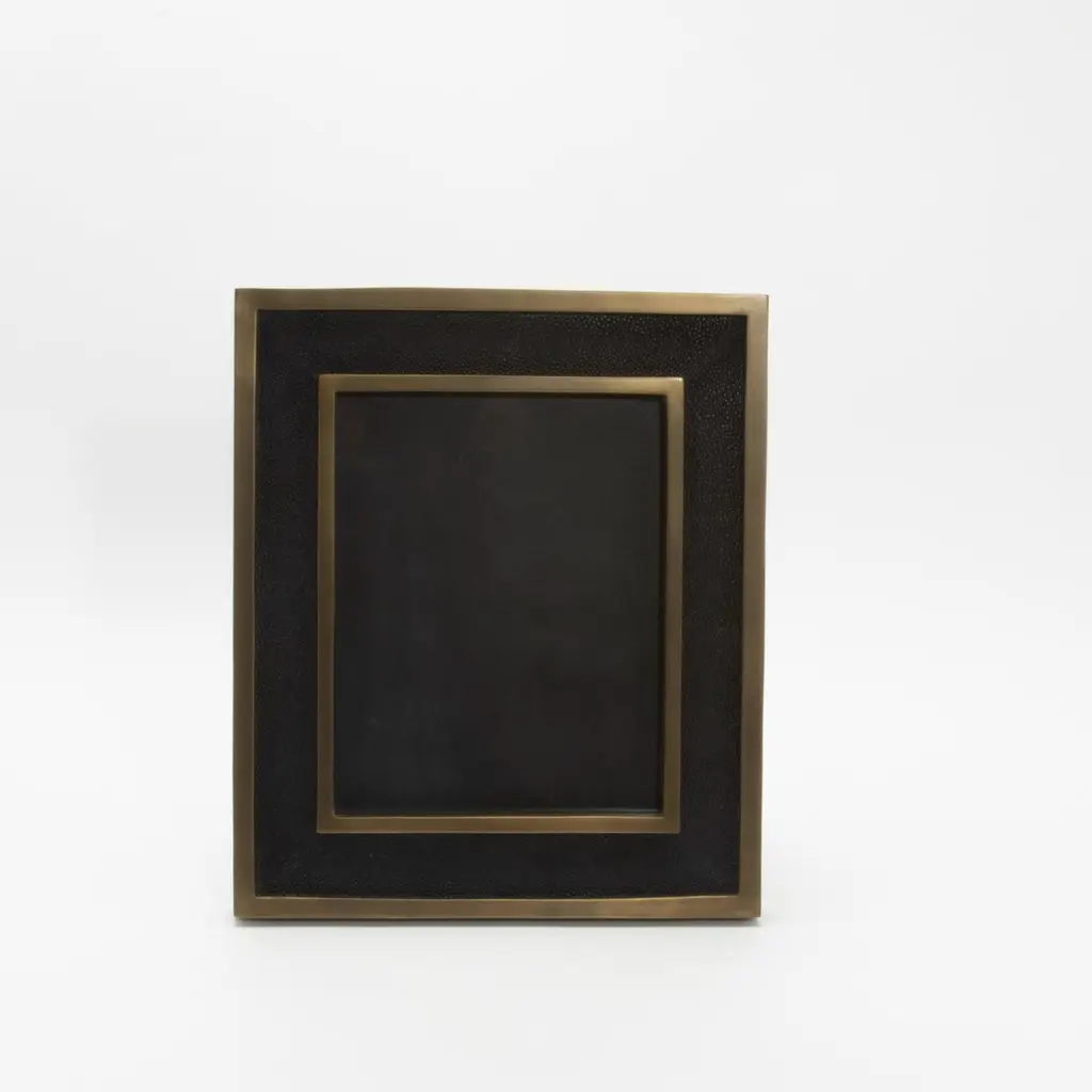 Exuding sophistication and timeless elegance, this 8x10” picture frame by Kifu Paris is a masterful blend of luxurious materials and impeccable craftsmanship. The frame is meticulously handcrafted with rich black shagreen, a refined texture reminiscent of stingray hide, enveloping the exterior and offering a tactile, opulent feel. Accentuating its modern silhouette, sleek brass detailing frames both the inner and outer borders, creating a striking contrast between the deep matte of the shagreen and the warm glow of brass. This item is on display in our LA showroomKeep away from direct sunlightColor variants may occur on the stingray and other exotic finishesClean with soft dry clothAbout KIFU PARIS:Kifu Augousti is an up-and-coming creator of modern furnishings, celebrated for her ability to blend the timeless elegance of the Art Deco tradition with a bold, contemporary flair. The daughter of renowned designers Ria and Yiouri Augousti, known as R&Y Augousti, Kifu has inherited a rich legacy while carving out her own distinctive style. Offbeat materials, sinuous curves, and wild patterns have become the hallmarks of her designs, cultivated from her early years in Paris to her current creative haven in Manila.Each piece in Kifu’s collection, whether furniture or accessories, is meticulously handcrafted by the finest artisans in the Philippines. These artisans, known for their unparalleled expertise, use only the best natural materials and apply intricate, hand-painted techniques, ensuring every item is a masterpiece. Available in exclusive showrooms in Paris, New York, and Los Angeles at the Pacific Design Center's MOGUL, her creations—ranging from sculptural benches with commanding bronze frames to exquisitely detailed boxes, trays and vases—are not just furnishings, but timeless treasures that represent the pinnacle of luxury and innovative design.