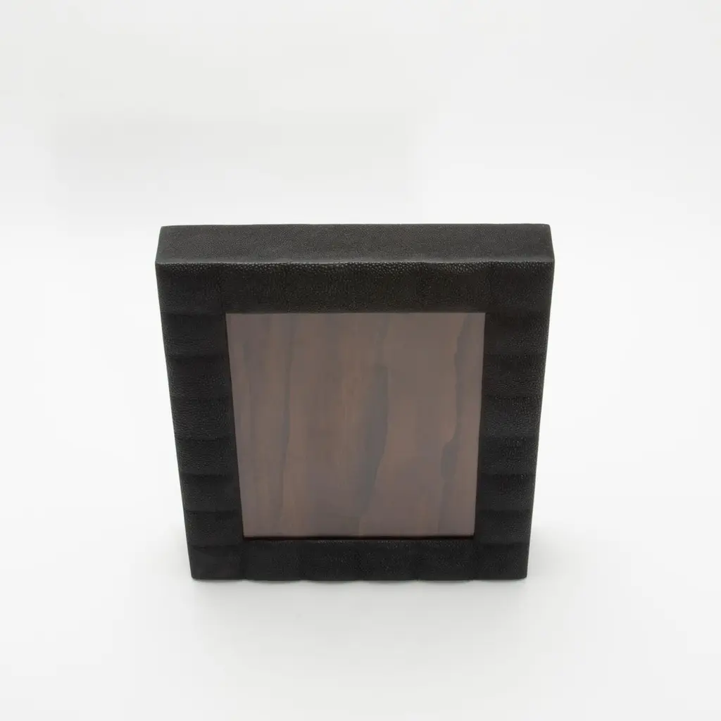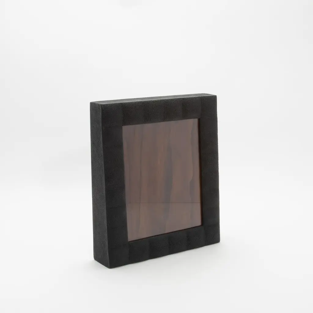This luxurious picture frame by R&Y Augousti is crafted in their signature quilted black shagreen, exuding both timeless elegance and modern refinement. The tactile texture of the shagreen finish contrasts beautifully with the smooth glass window, framed meticulously with hand-finished details. The rich wood backing provides a sophisticated depth, complementing the opulent materials while ensuring the frame is as functional as it is striking.This item is on display in our LA showroomColor variants may occur on the stingray and other exotic finishesClean with soft dry clothAbout R&Y AUGOUSTI:R&Y Augousti, created by the visionary husband-and-wife duo Ria and Yiouri Augousti, epitomizes the pinnacle of luxurious, globally inspired design. Since its inception in Paris in 1989, the brand has become synonymous with opulence, distinguishing itself through the masterful integration of shagreen with brass and other exotic materials. Each piece in their Art Deco-inspired collection is a testament to unparalleled craftsmanship, meticulously handcrafted by the finest artisans in the Philippines, ensuring that every creation is a unique masterpiece.Ria, hailing from Manila, and Yiouri, from Cyprus, share an exquisite passion for revivalist design, which has propelled R&Y Augousti to the forefront of luxury interiors. Their innovative use of materials, particularly the revival of shagreen, has set new standards in elegance and sophistication. The natural color variations on stingray and other exotic finishes further enhance the authenticity and bespoke nature of their designs.Today, R&Y Augousti’s collections grace the most exclusive showrooms in Paris, New York, and Los Angeles at the Pacific Design Center's MOGUL, continuing to redefine the essence of timeless luxury. Their work is not merely furniture; it is a celebration of art, craftsmanship, and the ultimate in refined living.