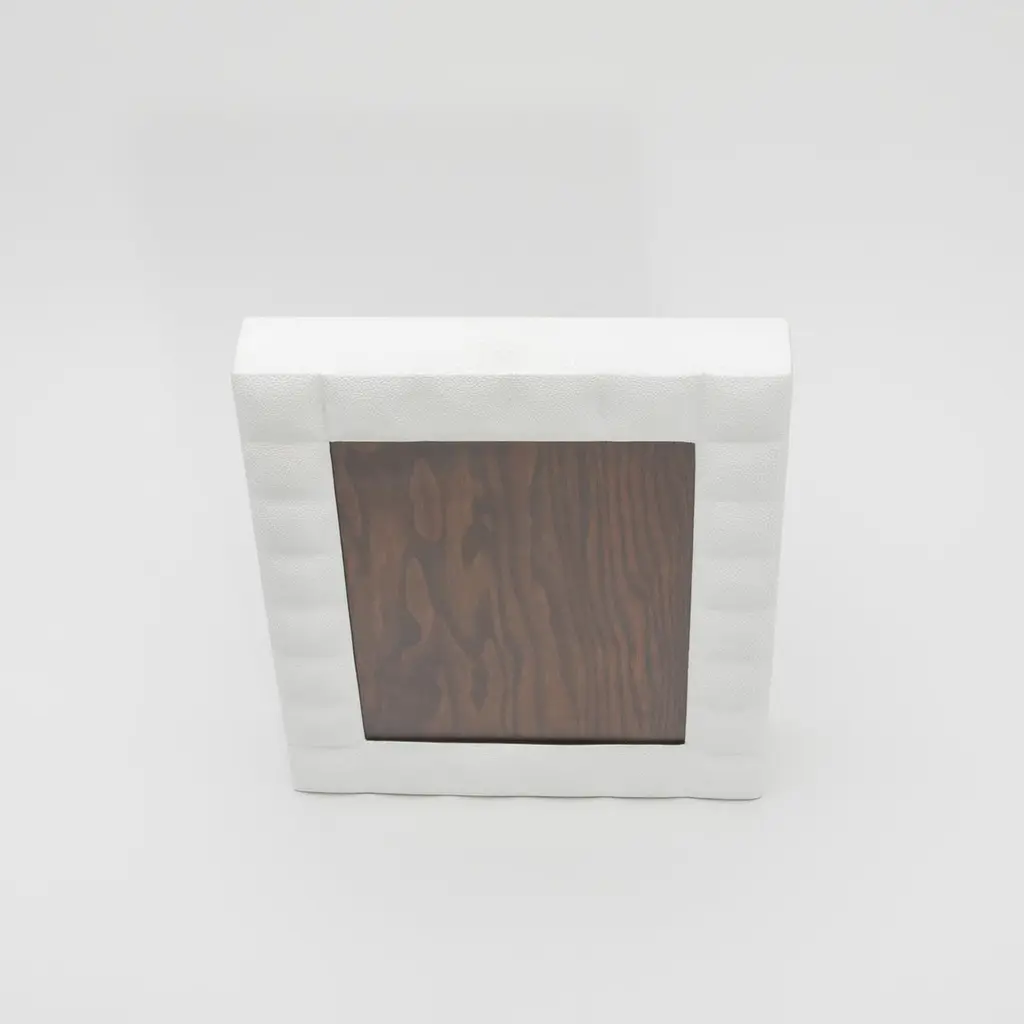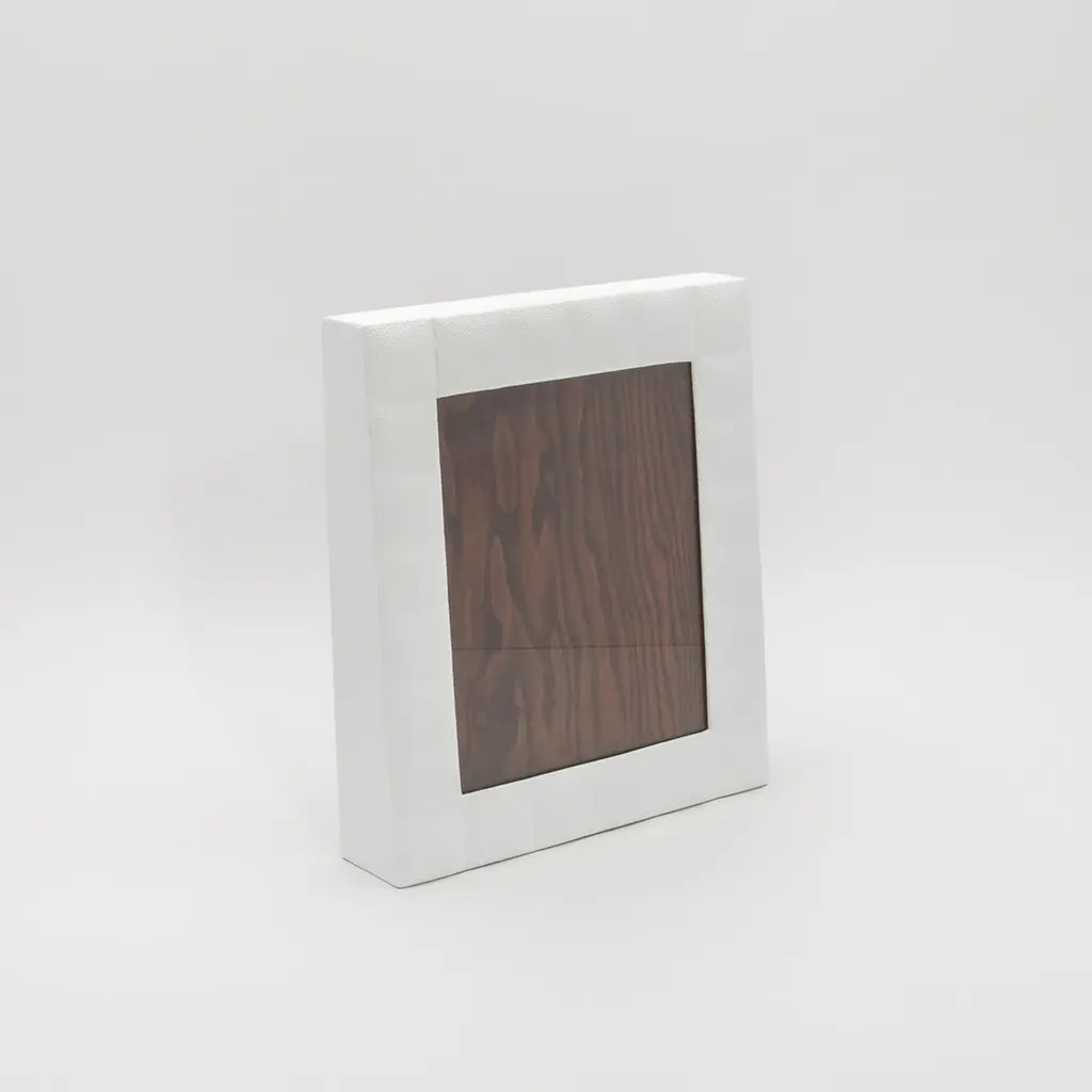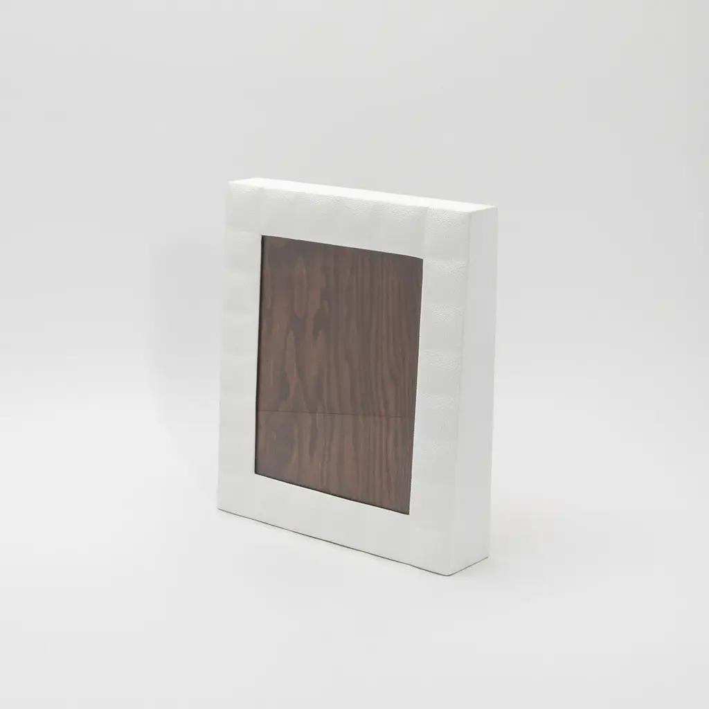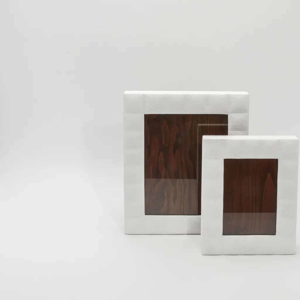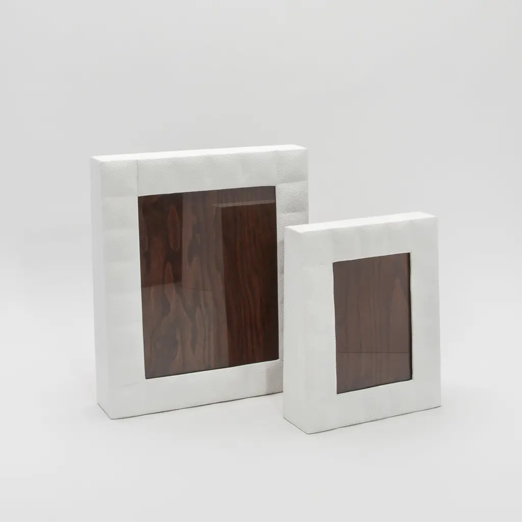 This luxurious picture frame by R&Y Augousti is crafted in their signature quilted white shagreen, exuding both timeless elegance and modern refinement. The tactile texture of the shagreen finish contrasts beautifully with the smooth glass window, framed meticulously with hand-finished details. The rich wood backing provides a sophisticated depth, complementing the opulent materials while ensuring the frame is as functional as it is striking. This item is on display in our LA showroomColor variants may occur on the stingray and other exotic finishesClean with soft dry clothAbout R&Y AUGOUSTI:R&Y Augousti, created by the visionary husband-and-wife duo Ria and Yiouri Augousti, epitomizes the pinnacle of luxurious, globally inspired design. Since its inception in Paris in 1989, the brand has become synonymous with opulence, distinguishing itself through the masterful integration of shagreen with brass and other exotic materials. Each piece in their Art Deco-inspired collection is a testament to unparalleled craftsmanship, meticulously handcrafted by the finest artisans in the Philippines, ensuring that every creation is a unique masterpiece.Ria, hailing from Manila, and Yiouri, from Cyprus, share an exquisite passion for revivalist design, which has propelled R&Y Augousti to the forefront of luxury interiors. Their innovative use of materials, particularly the revival of shagreen, has set new standards in elegance and sophistication. The natural color variations on stingray and other exotic finishes further enhance the authenticity and bespoke nature of their designs.Today, R&Y Augousti’s collections grace the most exclusive showrooms in Paris, New York, and Los Angeles at the Pacific Design Center's MOGUL, continuing to redefine the essence of timeless luxury. Their work is not merely furniture; it is a celebration of art, craftsmanship, and the ultimate in refined living.