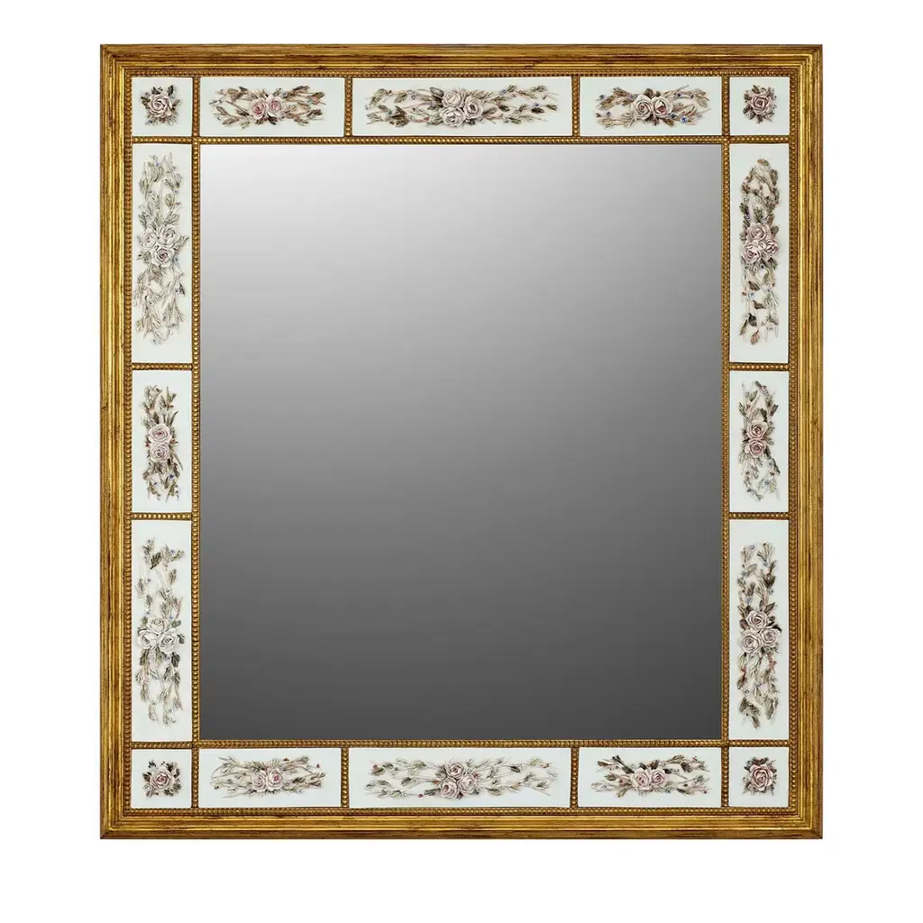 Patinated gold-leaf gilded wooden frame with applications of biscuit Capodimonte porcelain with roses colored with third-fired and handmade colors. Please, contact the Concierge service for further information.
