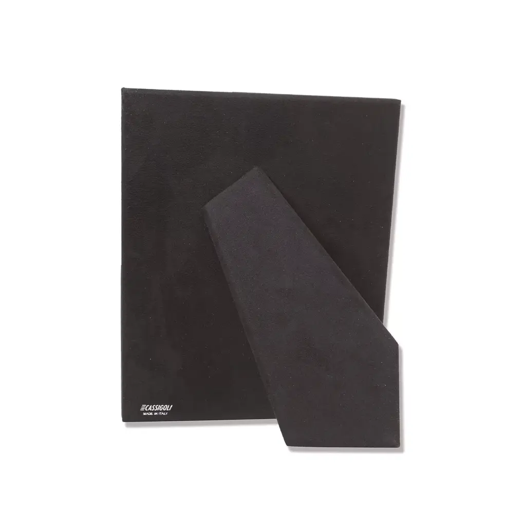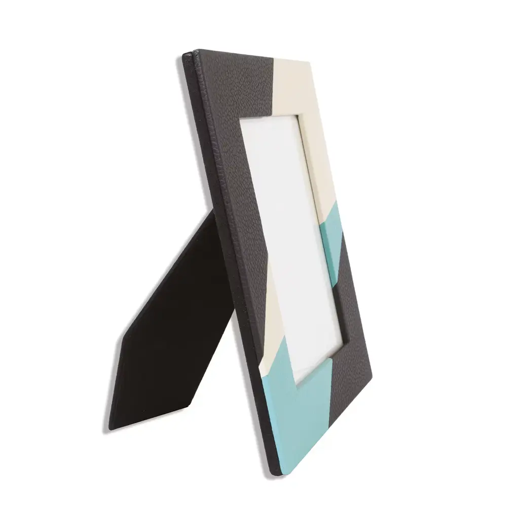 This stupendous wooden photo frame features a modern and versatile character and a precious allure marked by the handcrafted, full-grain leather inlays it showcases. Light blue, black, and white geometric shapes merge into a captivating pattern of bold visual impact. An exquisite gift idea for a loved one.