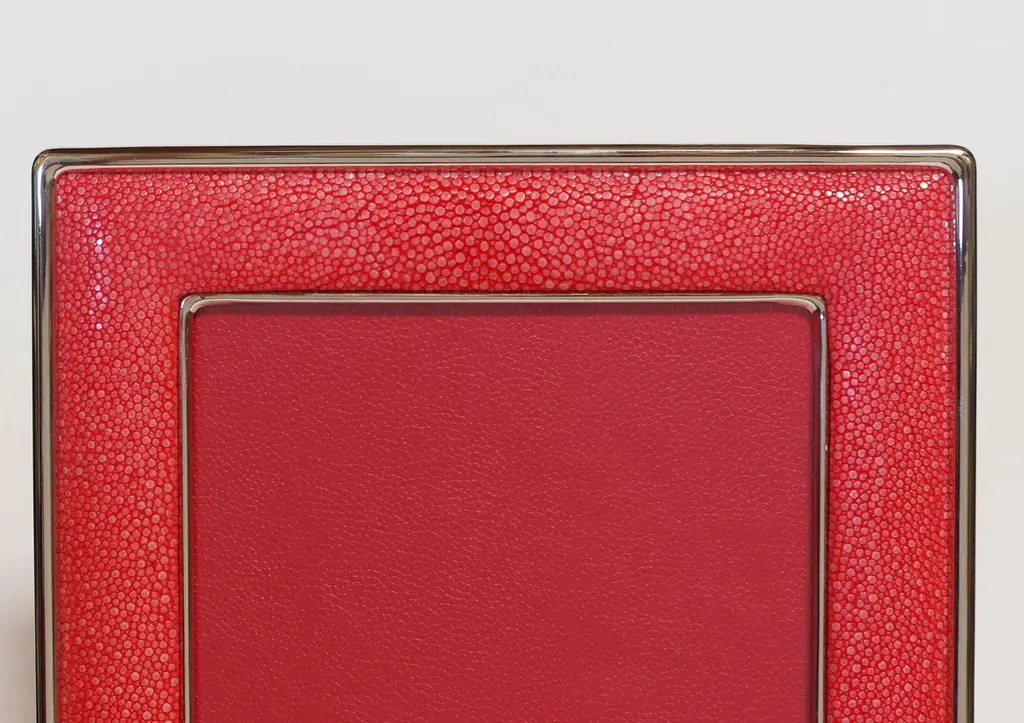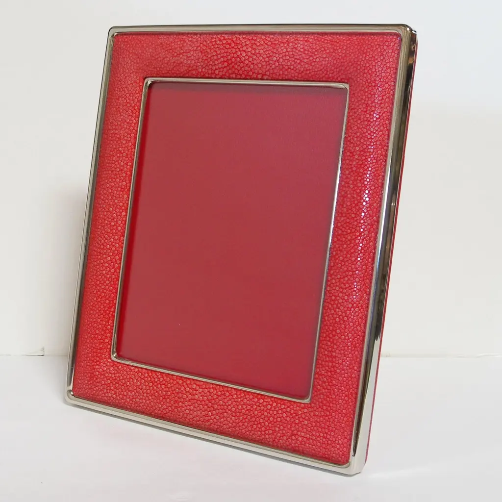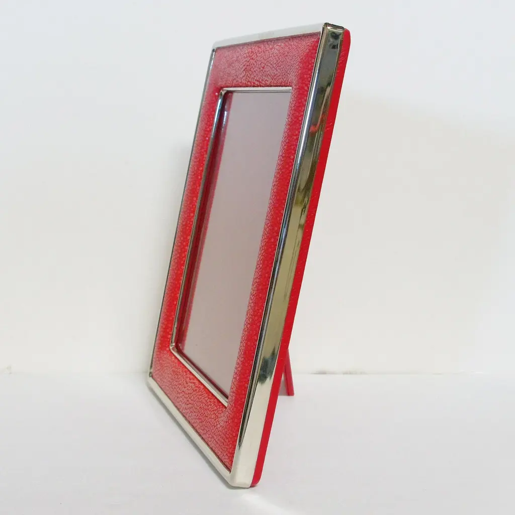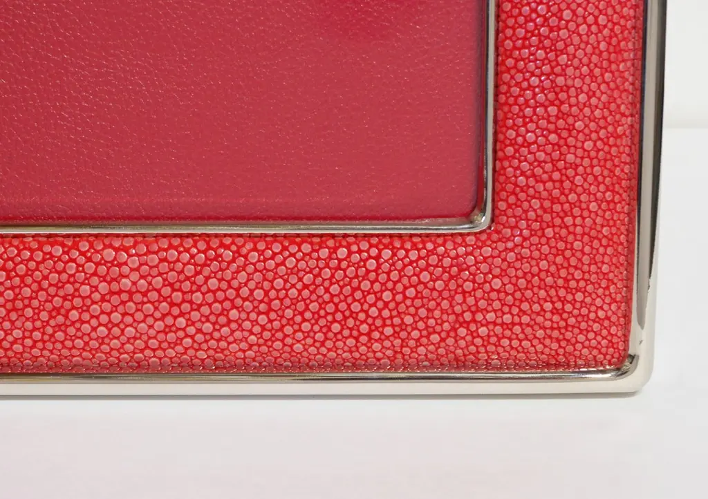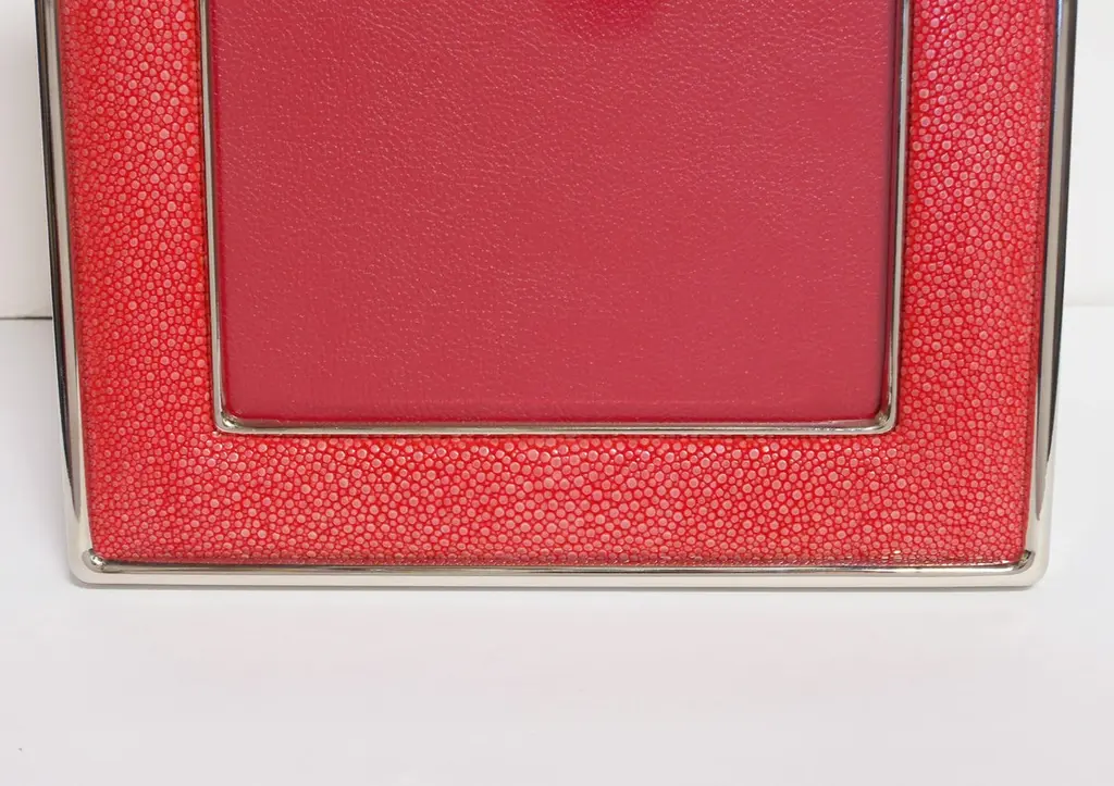 Red shagreen leather and nickel plated photo frame with presentation red leather box by Fabio LtdHeight: 13 inches / Width: 11.5 inches / Depth: 1 inch Photo Size: 8 inches by 10 inchesLAST 2 in stock in Los AngelesOrder Reference #: FABIOLTD MR37This piece makes for great and unique gift!