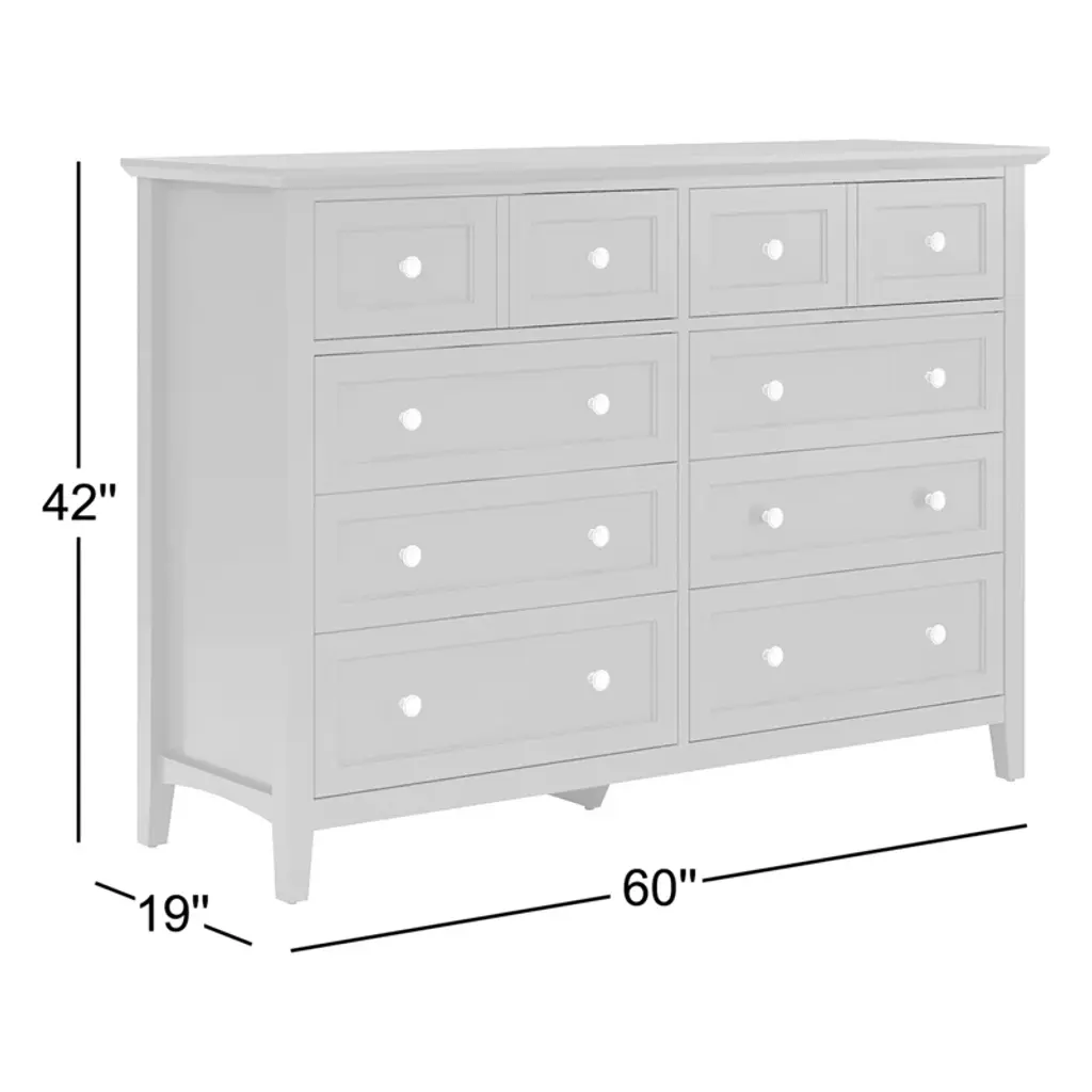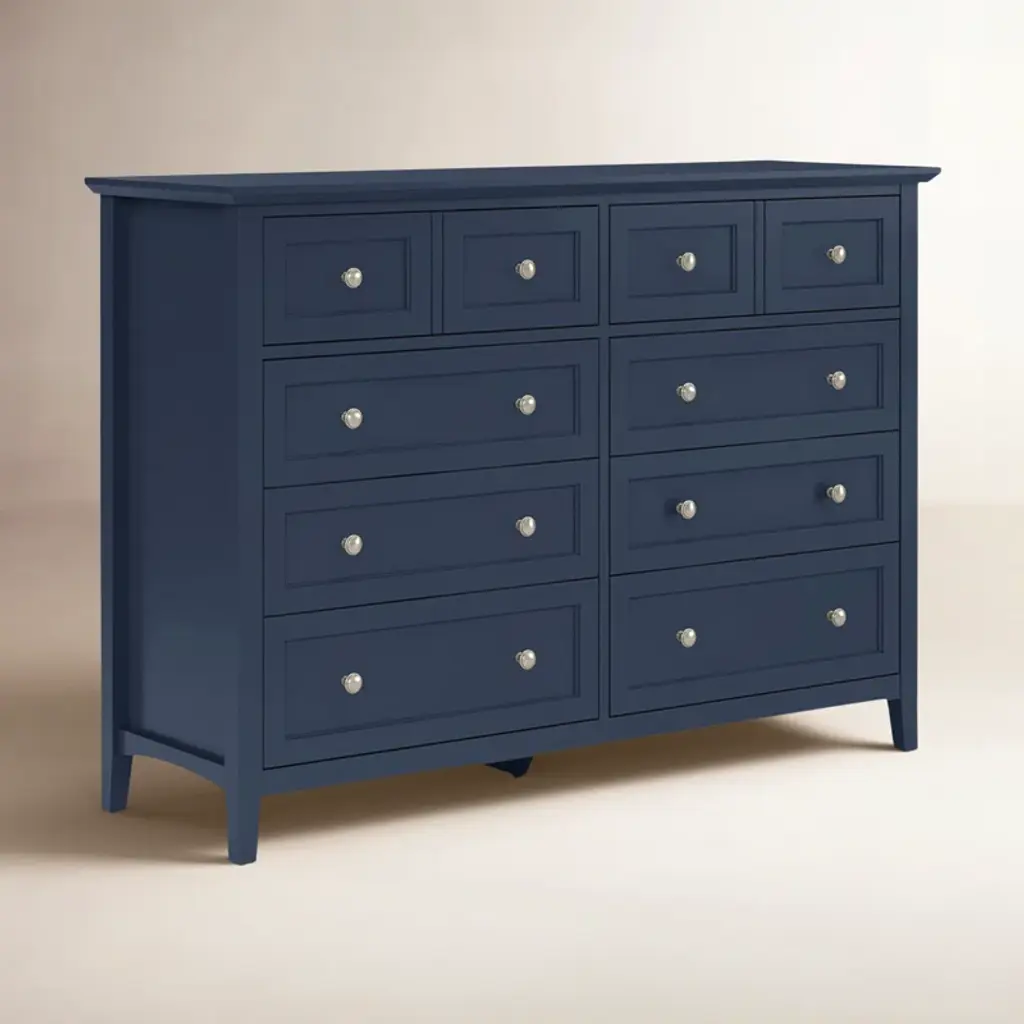This double dresser offers traditional shaker-inspired style and plenty of storage. It's crafted from solid and engineered wood and houses eight roomy drawers on smooth ball-bearing glides - likely enough for a wardrobe or two. We love the special details, like the beveled top, picture frame paneling, and traditional round pulls.