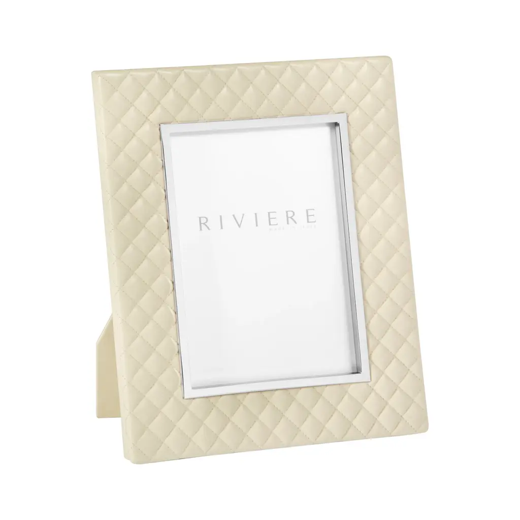 A touch of couture for your living room, the Giobagnara x Riviere Anita Picture Frame is a glamorous design from the Riviere collaboration. Expertly handcrafted in Italy, its surface is wrapped in soft, padded leather stitched into a timeless quilted diamond pattern. A sleek, polished metal trim elegantly outlines the frame, creating a brilliant contrast. A perfect fusion of high-fashion texture and refined detail, it transforms a personal memento into a true decorative jewel for any surface. Highlights:
