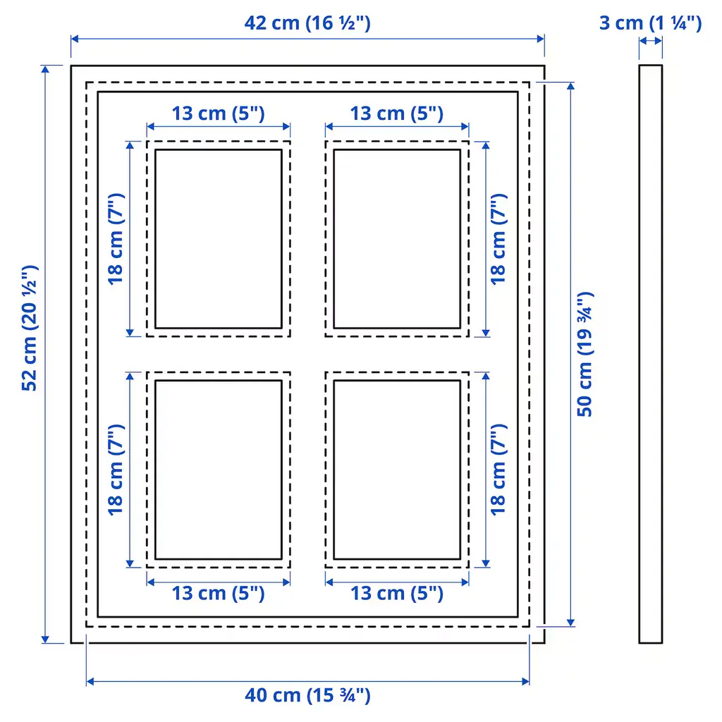 RÖDALM Frame for 4 pictures - white 15 ¾x19 ¾ ". You can choose to frame your picture in different ways – close to the front or behind the inner frame to add depth. And with or without the included mount. With ALFTA adhesive hook you can easily hang this frame without nails or screws.