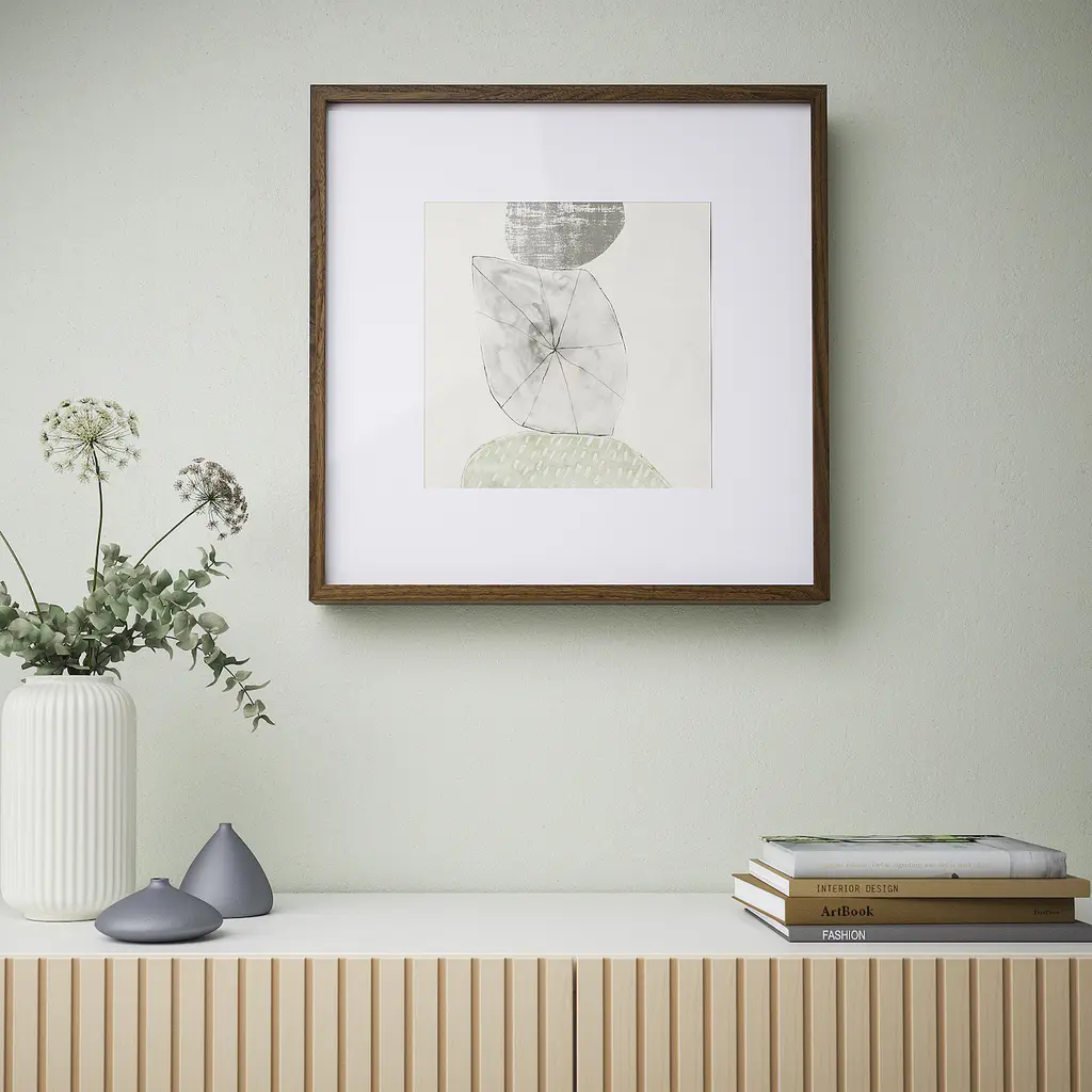 SANNAHED Frame - walnut effect 19 ¾x19 ¾ ". This frame is ideal to use with ALFTA adhesive hook. With the hook you can easily hang the frame without nails or screws and decorate your walls with pictures. You can place the motif on the front or back of the extra deep frame. Mat included.
